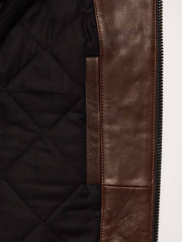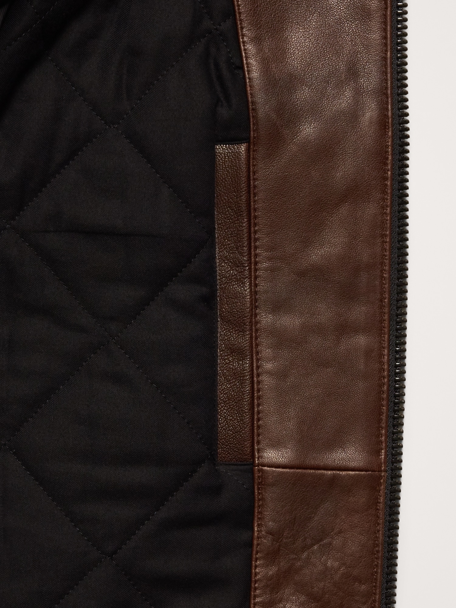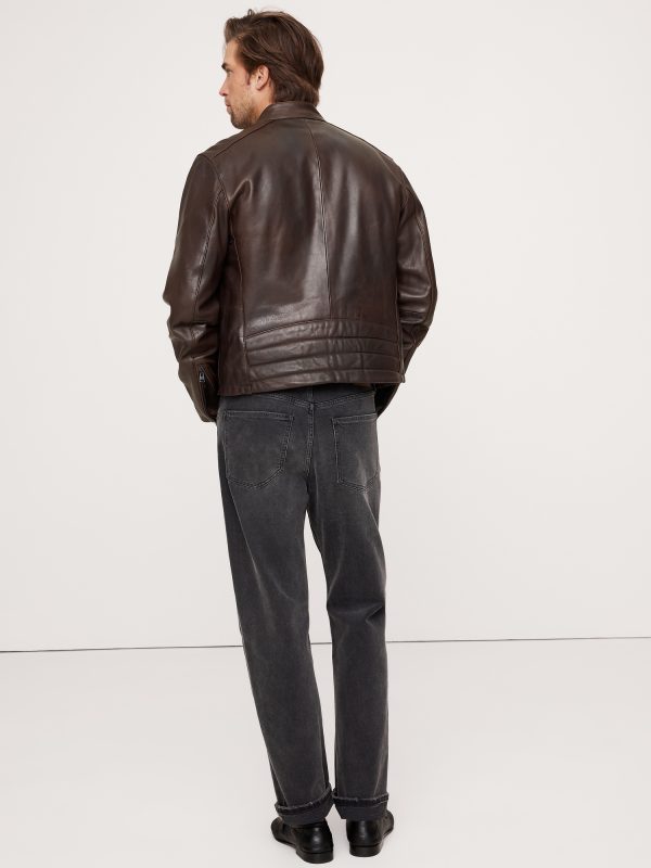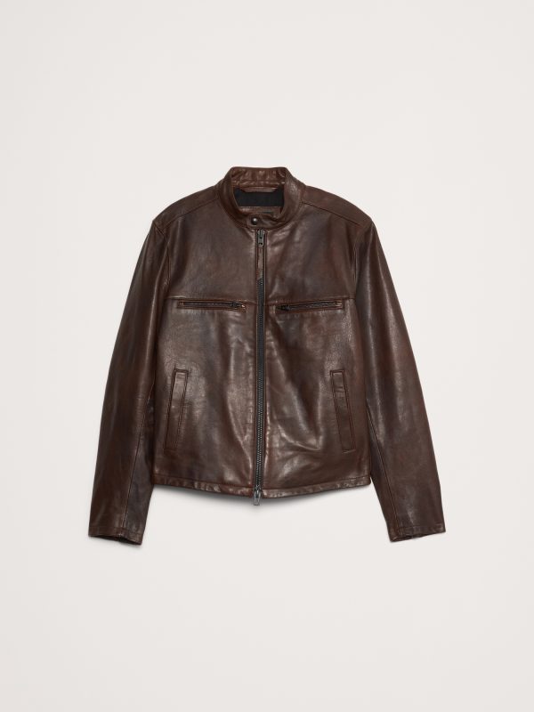 A classic rendering of the timeless moto jacket, complete with all the traditional design details: a banded collar over the neck and grommets under the arms to prevent overheating. This one’s in a premium leather that only gets better with time, developing a rich and unique patina.