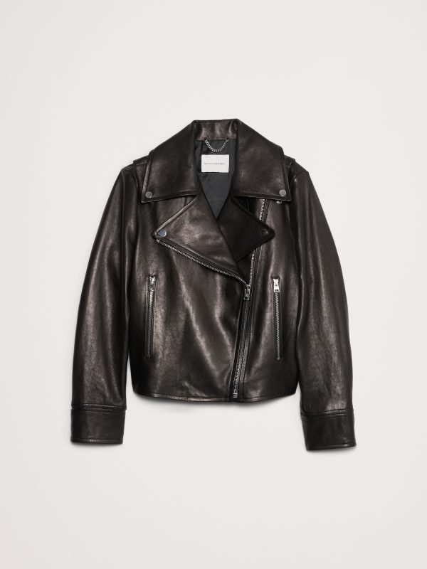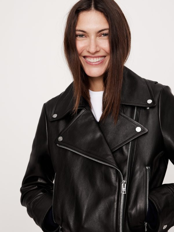 A relaxed and slightly cropped take on the moto jacket, our designers selected a specially-tanned lambskin leather here. We love the way softens with every wear, developing a unique patina with every wear.