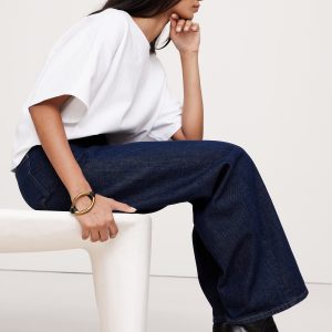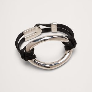 A bold exploration of contrasting textures, this bracelet juxtaposes a fluid oval against luxurious leather. Here, artisans handcraft each piece from either 14k-gold or 999-silver plated brass.