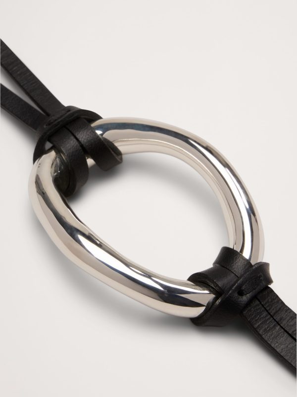 A bold exploration of contrasting textures, this bracelet juxtaposes a fluid oval against luxurious leather. Here, artisans handcraft each piece from either 14k-gold or 999-silver plated brass.