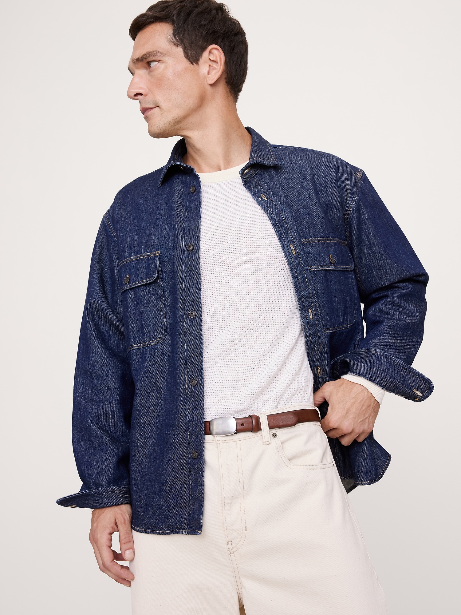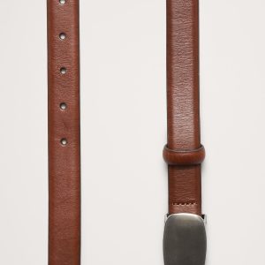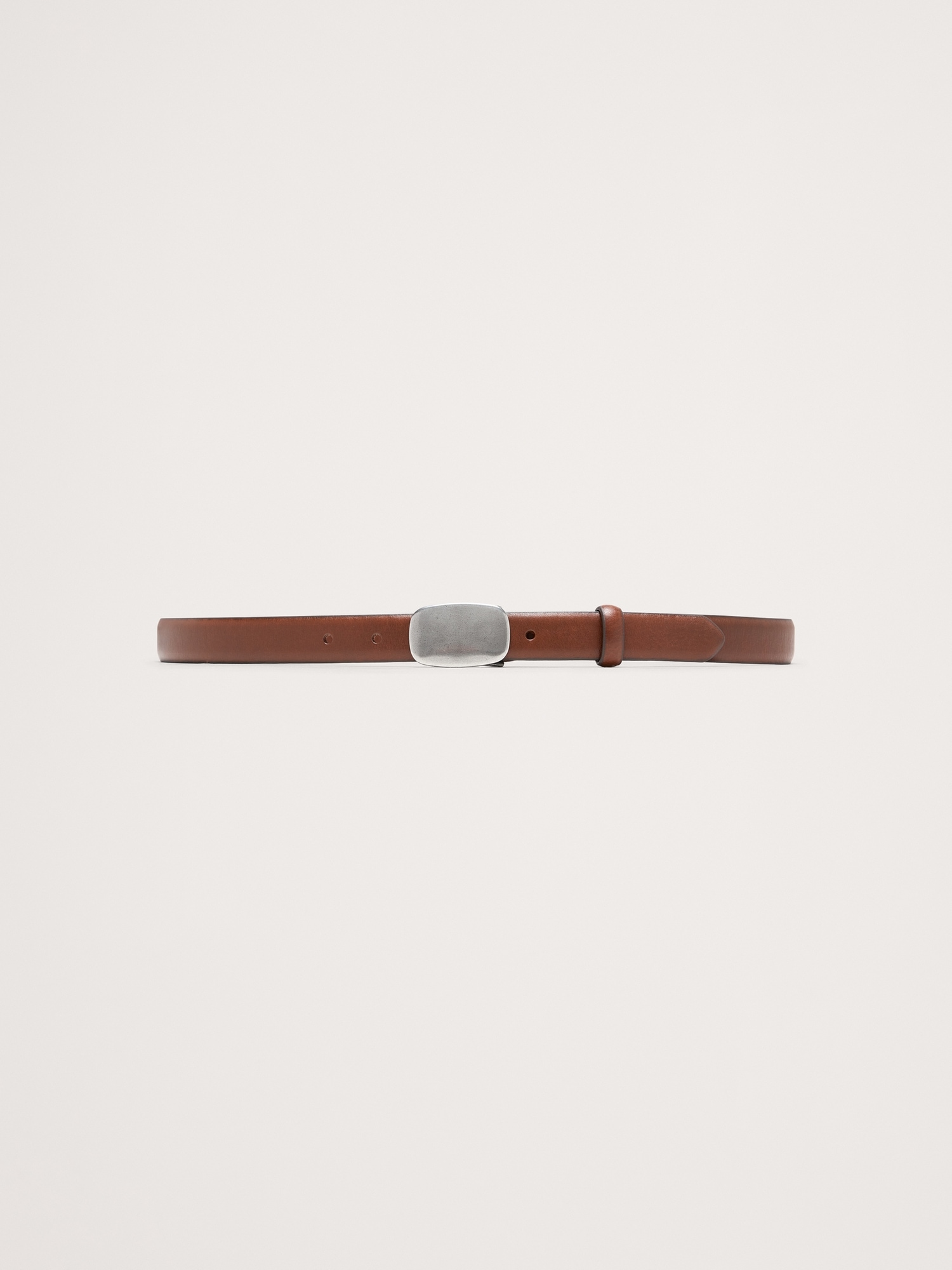 Like a streamlined take on a Western classic, this sturdy leather belt has beautifully burnished edges and a minimalist plaque buckle.