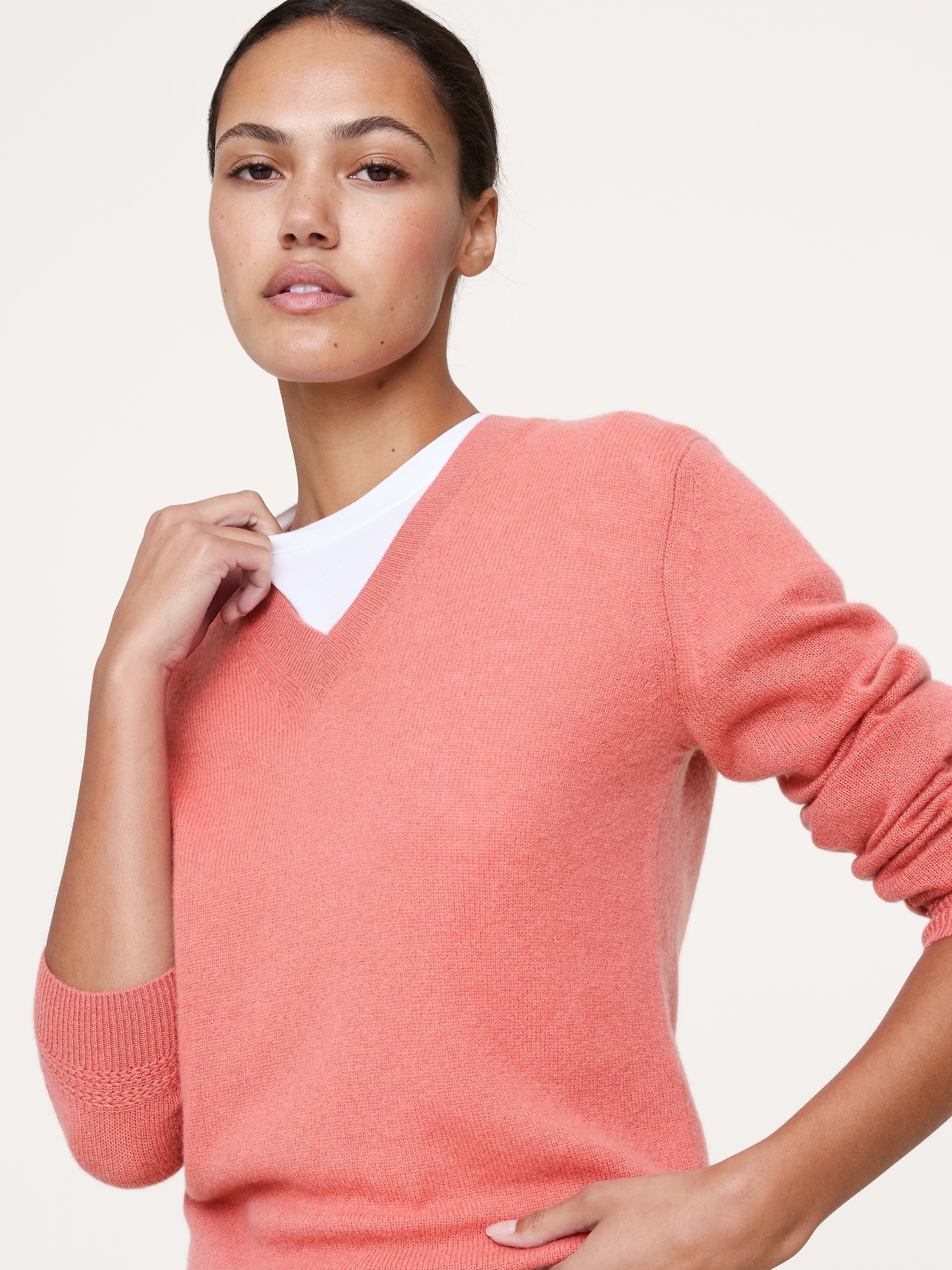 The vibe is lightweight luxury. This updated take on the classic V-neck sweater has not-too-loose fit through the body. We knitted it from our lightweight cashmere yarn, selected for its luxurious softness and all-season weight.