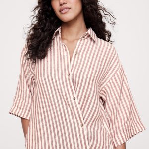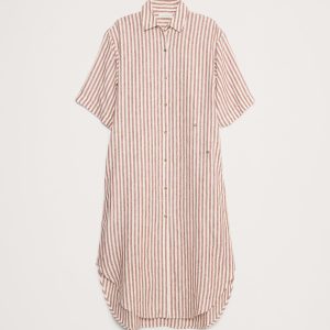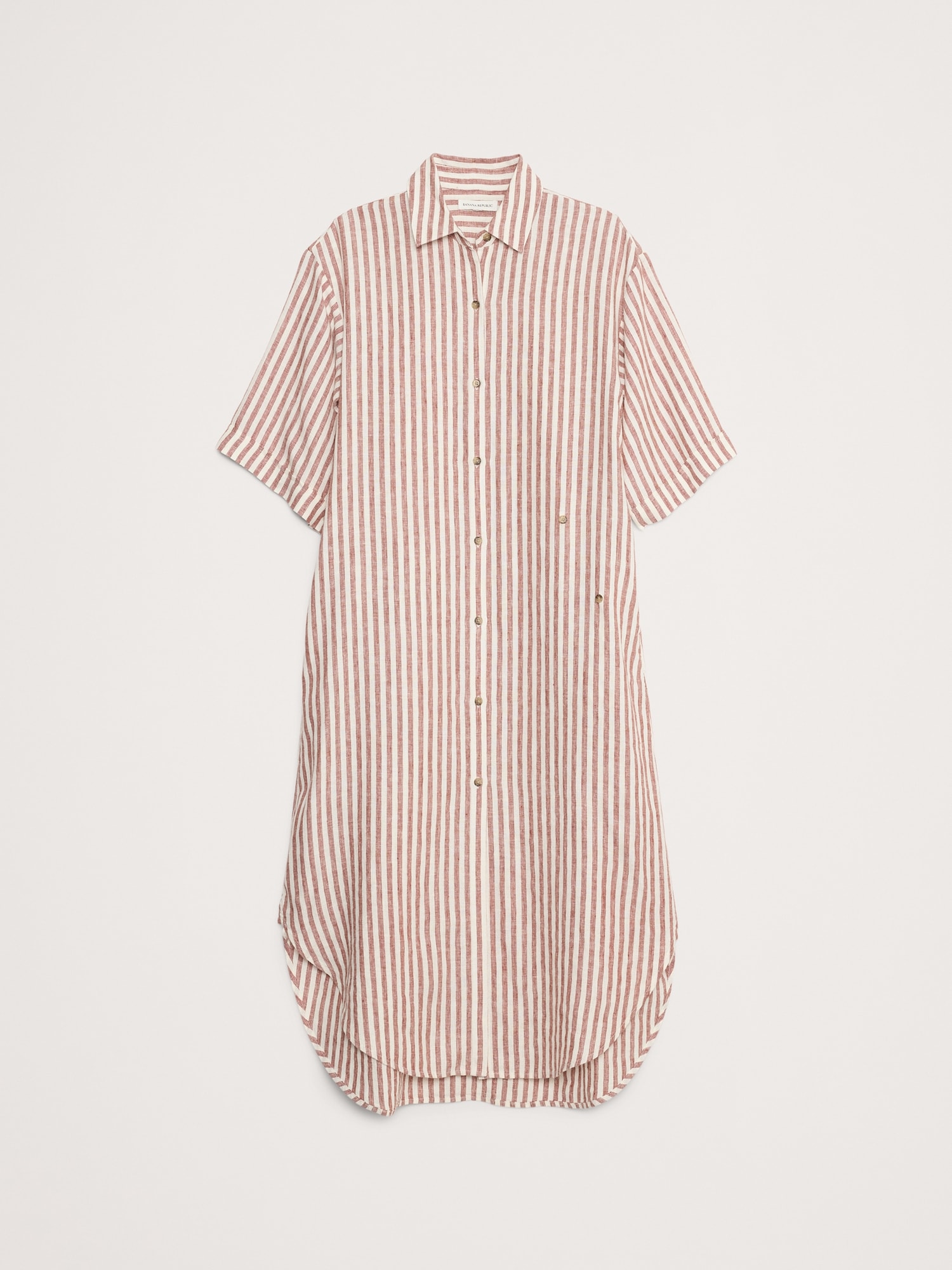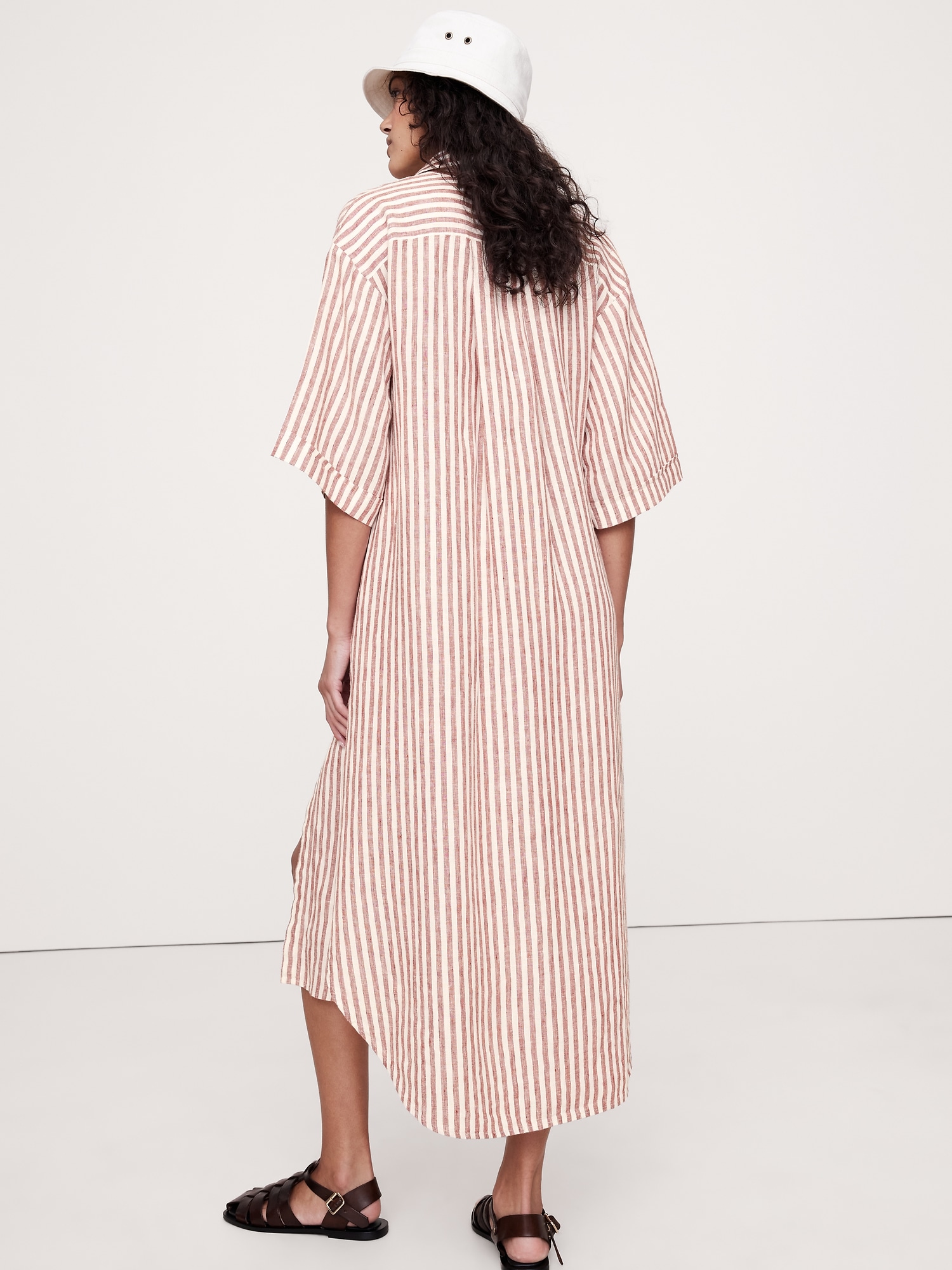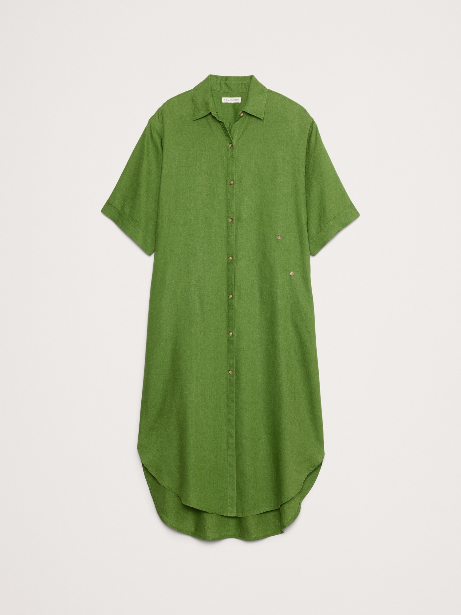 A best-selling style now in 100% certified-European linen, this dress features two sets of buttons: one to wear as an oversized button-front shirt dress and a second set to style as an asymmetrical wrap dress.
