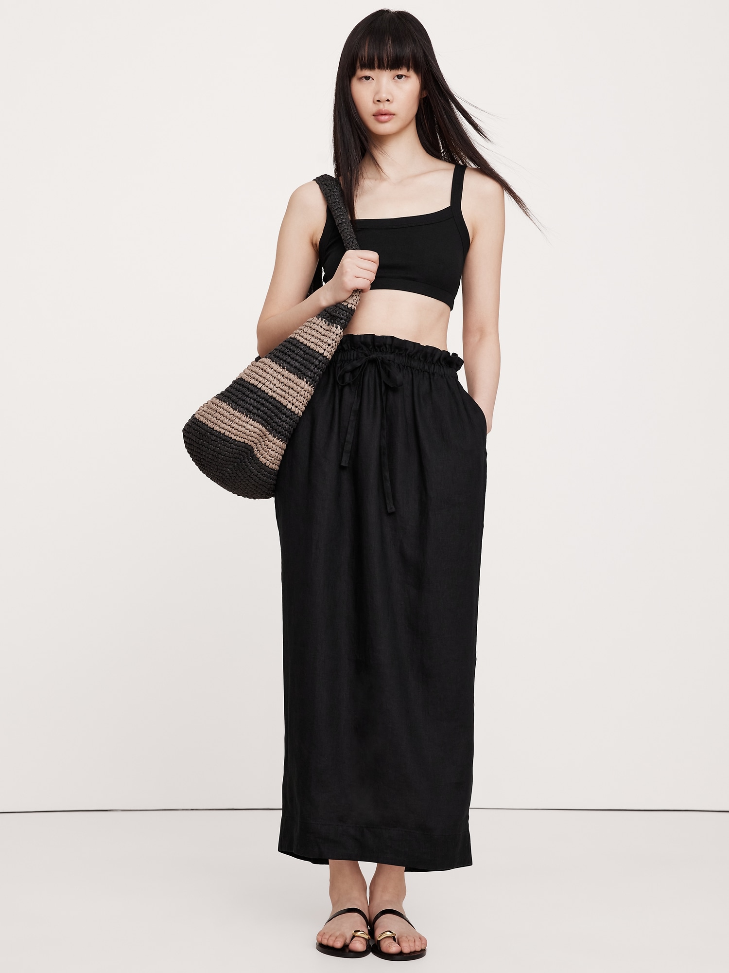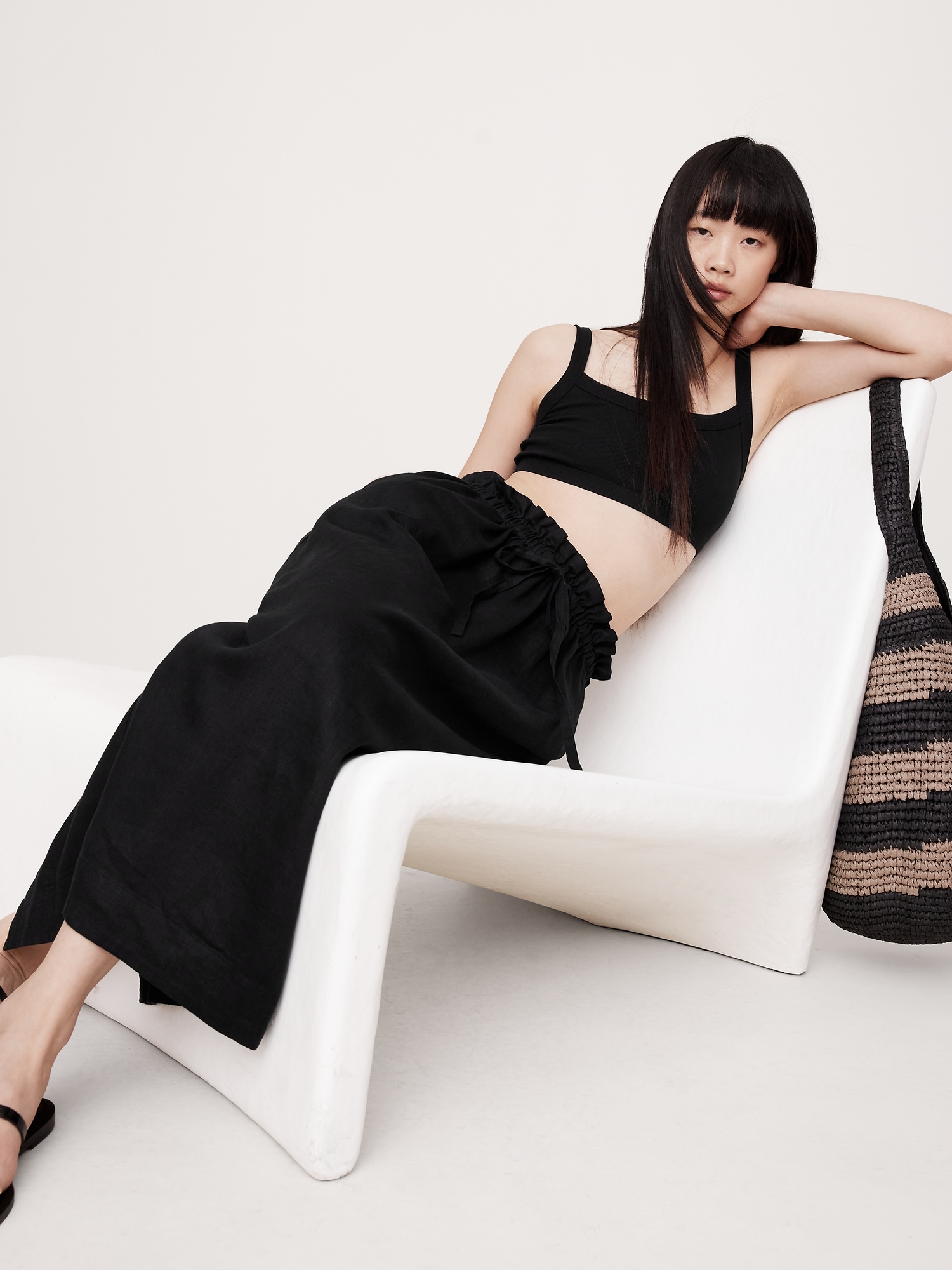 The vibe is off-duty. This column-style skirt has drawstring waist and a straight fit through the body, cut from 100% certified-European linen—an ideal choice in hot, humid weather.