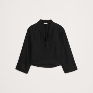 An easy popover top, in 100% certified-European linen. We added wide sleeves and a split neck with a single button.