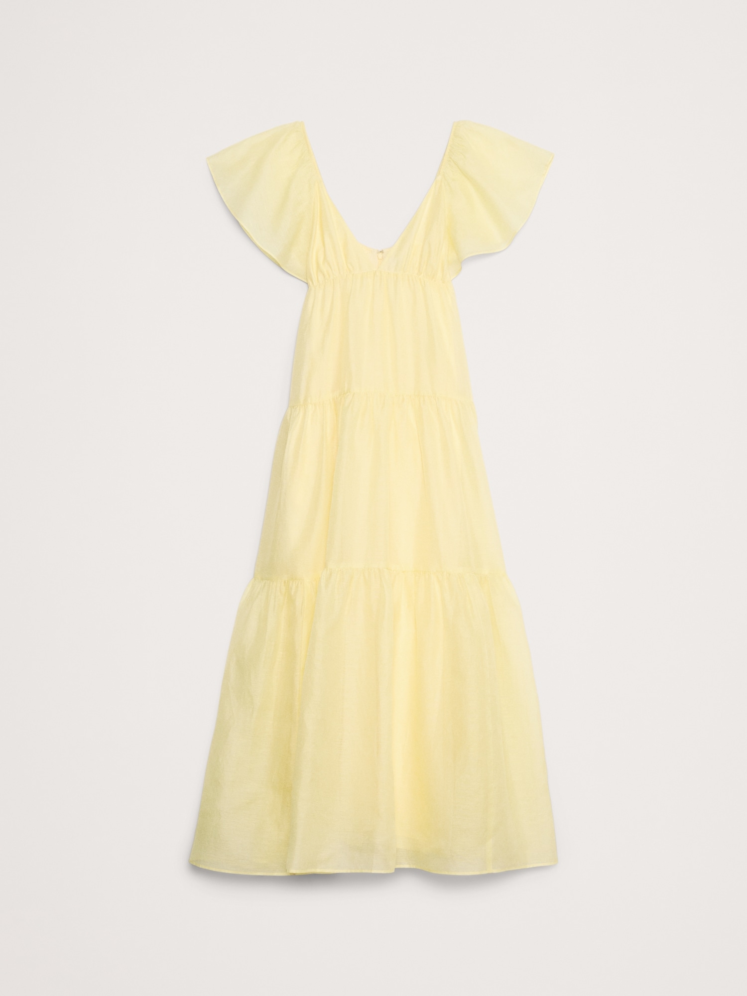 A super-special dress. This tiered maxi dress is all about the details: a flutter sleeve, empire waist, and flowy maxi skirt. Cut from a lightweight blend of linen and silk, it looks (and feels) amazing on.