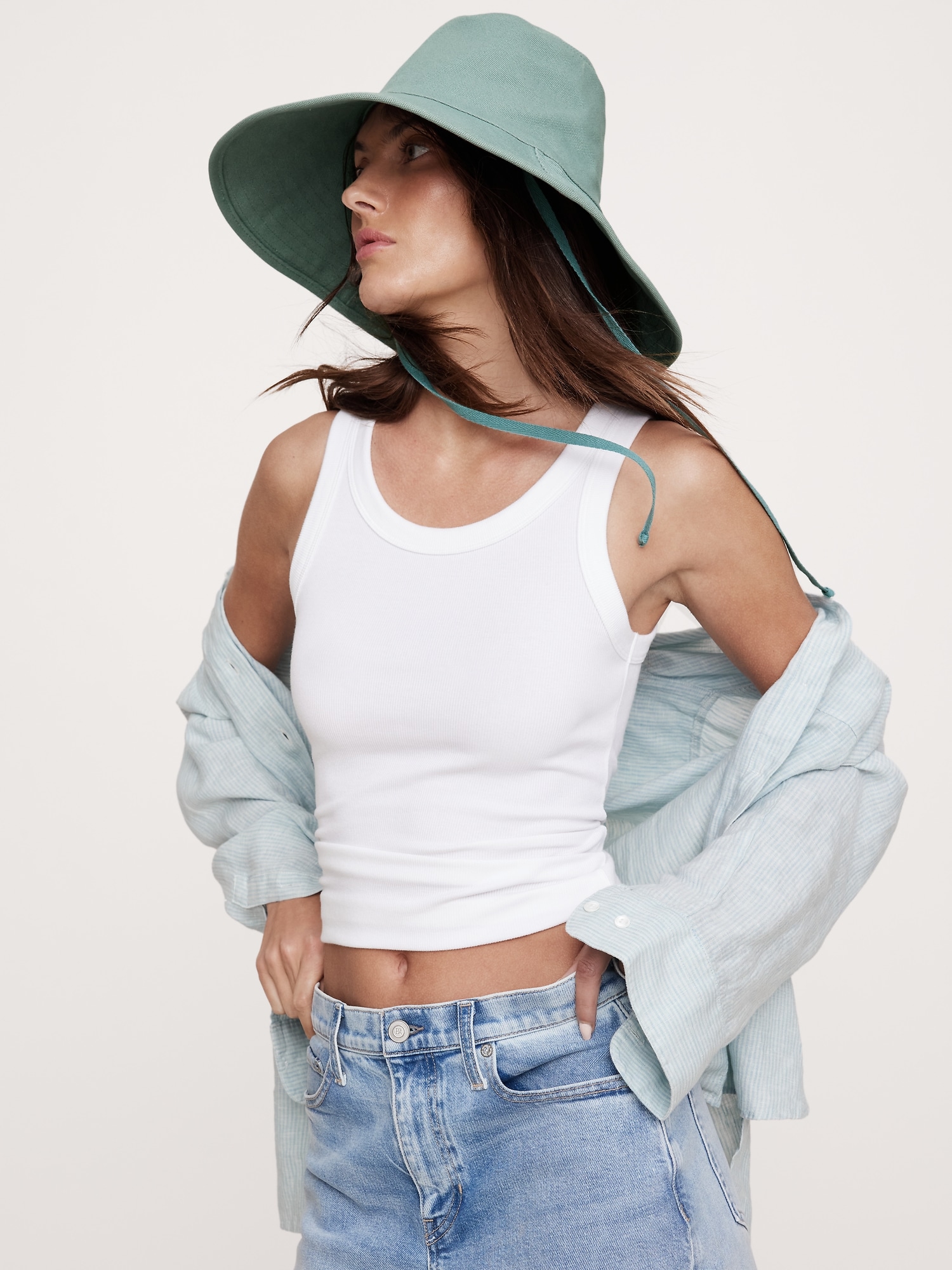 A classic canvas sun hat, with an optional chinstrap to keep it in place.