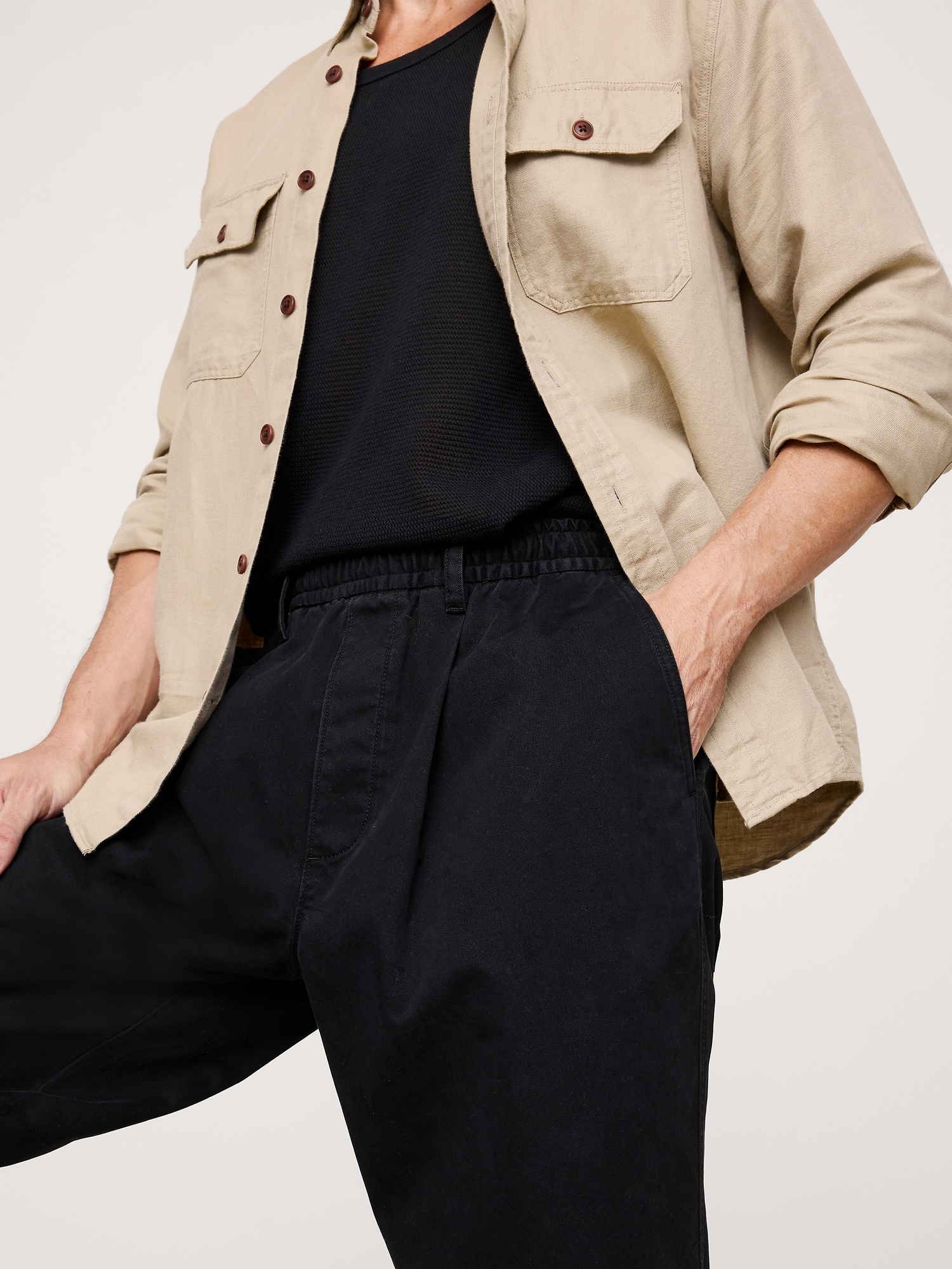 A decidedly cool pull-on pant, cut from a lightweight cotton twill. We kept the fit loose and added a pleated front for a vintage vibe.
