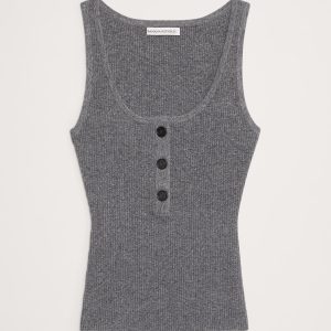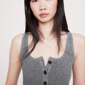 A cute ribbed tank with henley details, knitted in a soft blended yarn of all-weather Merino wool and cotton.
