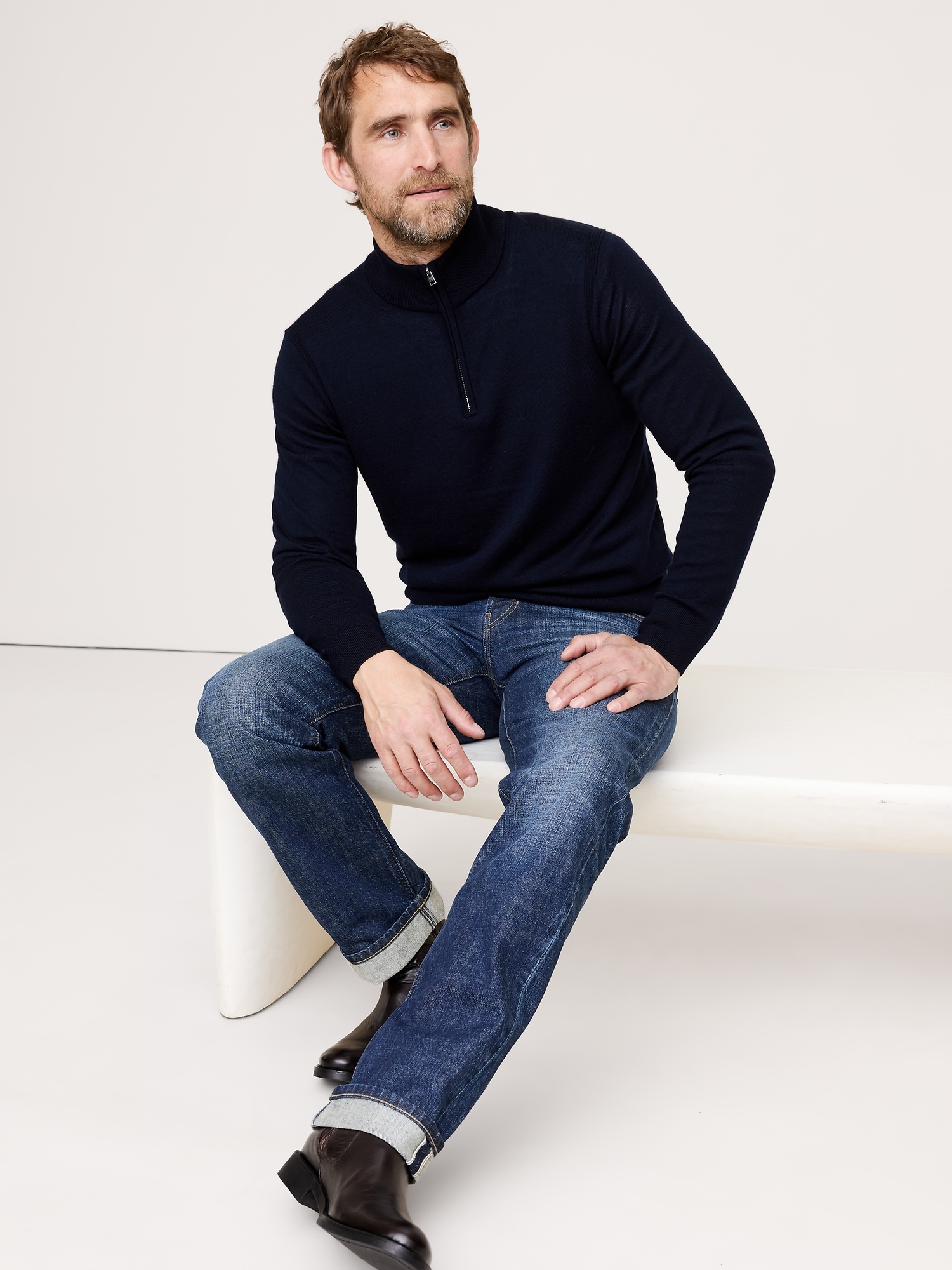 Looks good, feels good. A classic half-zip sweater, crafted in beautifully warm and soft Merino wool, produced according to the NATIVA™ protocol.