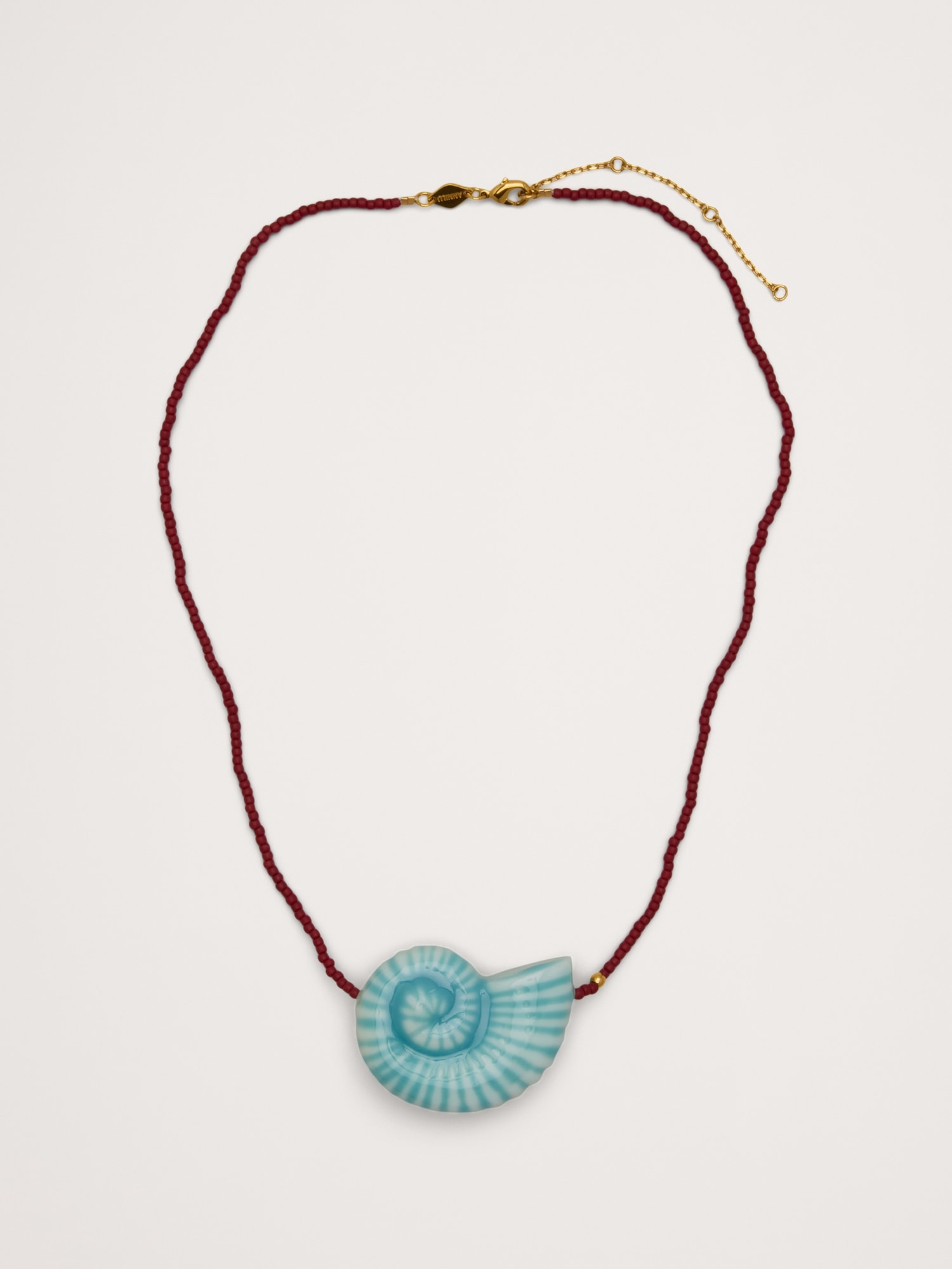 The Nautilus Necklace is inspired by the transformative nature of the nautilus shell, symbolizing growth, home and evolution. Featuring a deep berry colored chain, this necklace captures the essence of the shell’s expanding inner space, making it a meaningful and elegant statement piece.