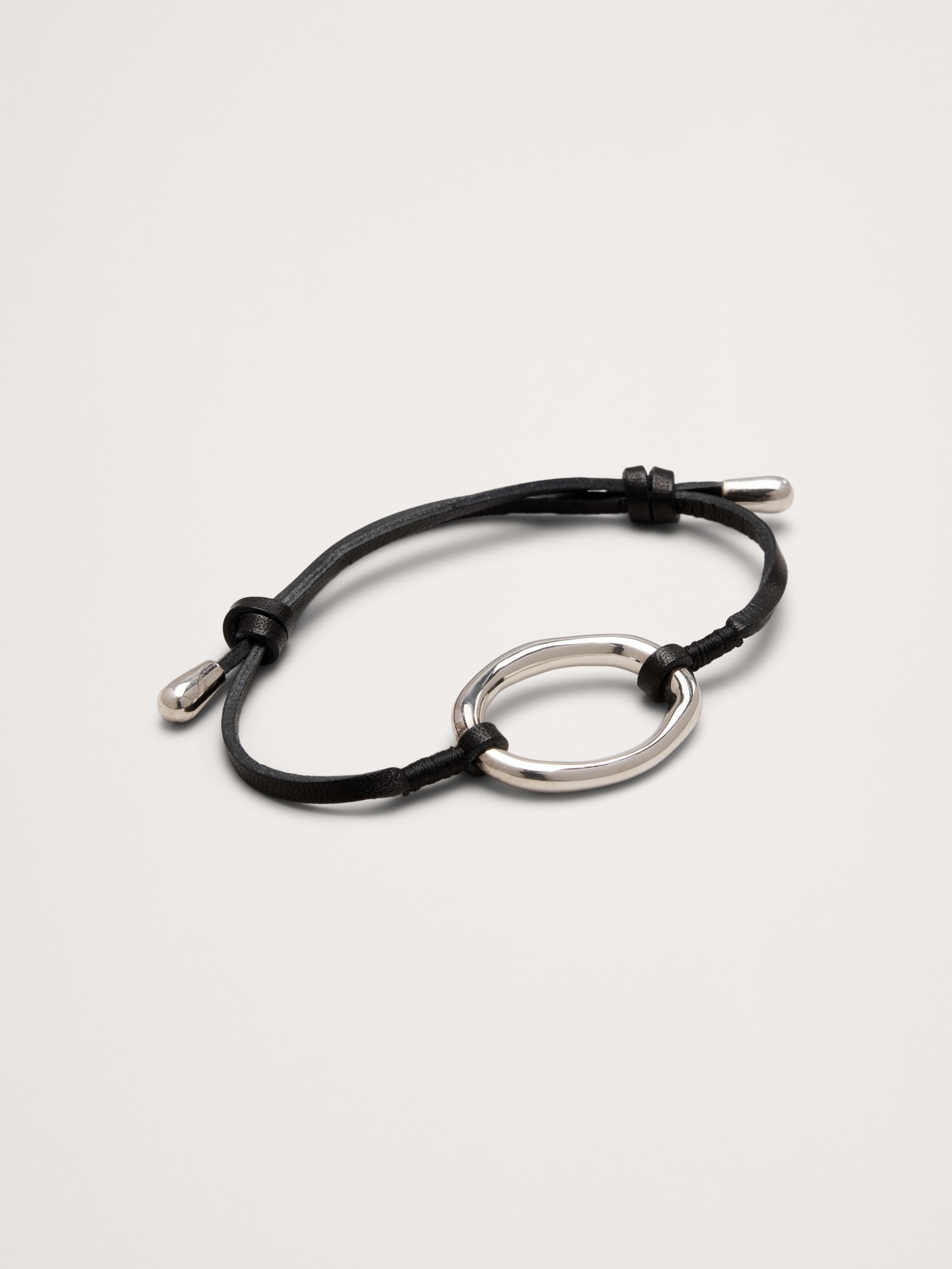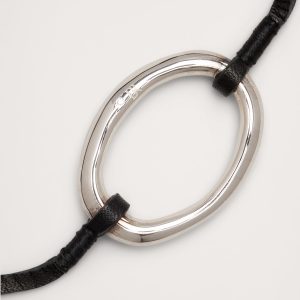 A coiled silver ring suspended from a simple, leather cord, finished in 999-silver plated brass.