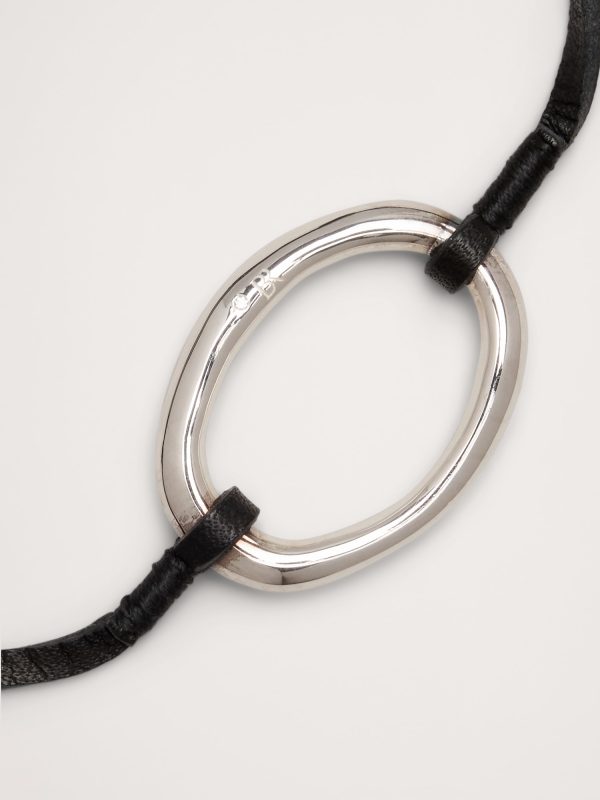 A coiled silver ring suspended from a simple, leather cord, finished in 999-silver plated brass.