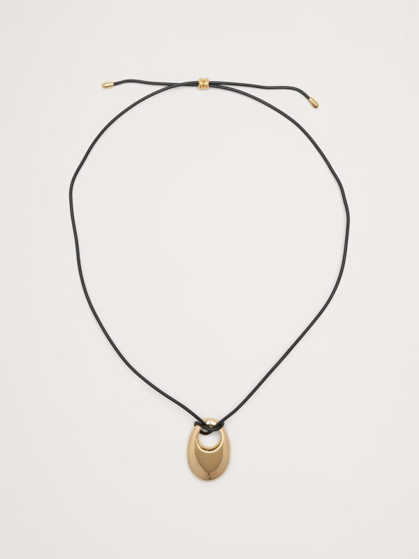 A sculptural silver ring suspended from a simple, leather cord, finished in 999-silver plated brass.