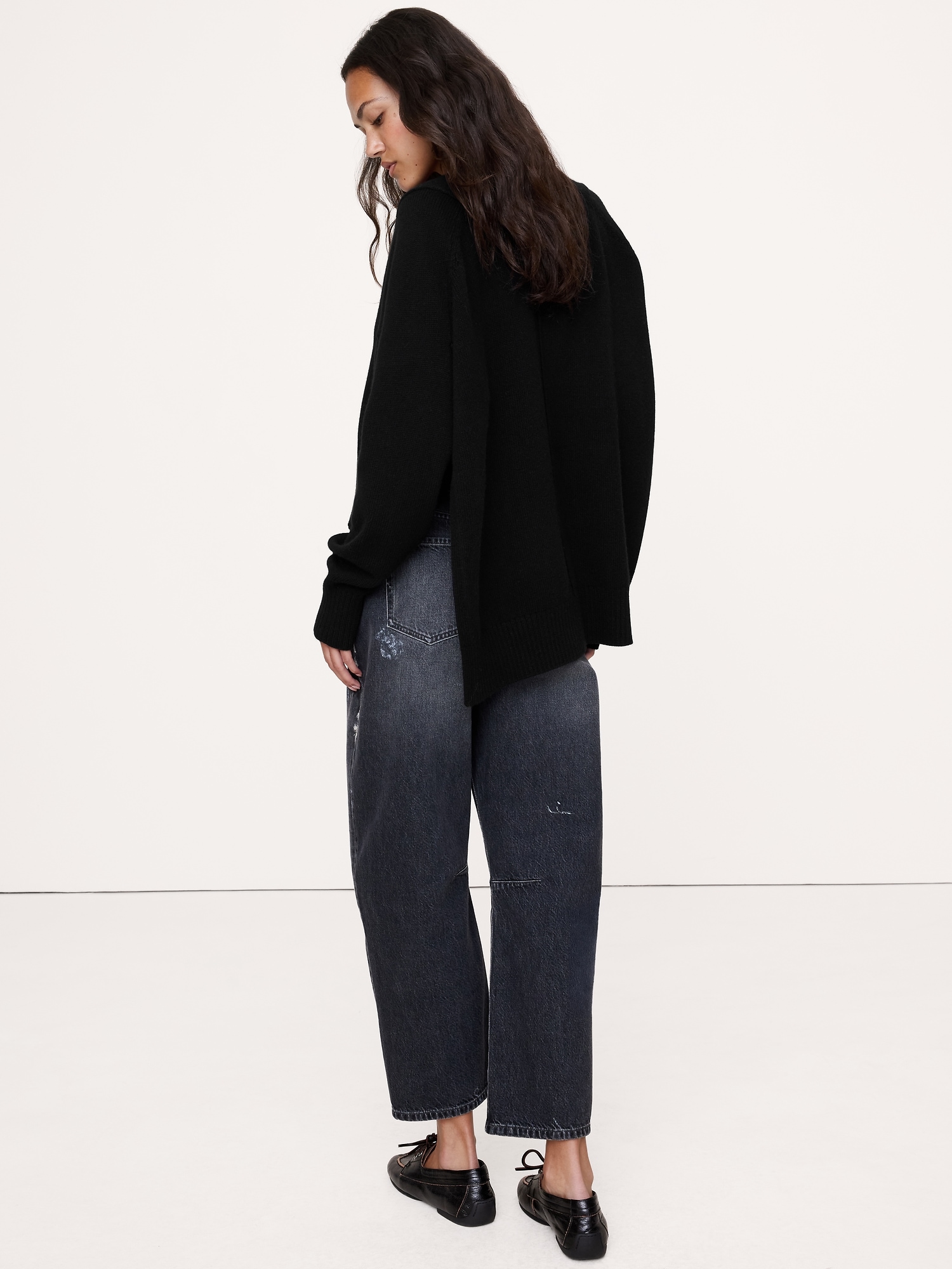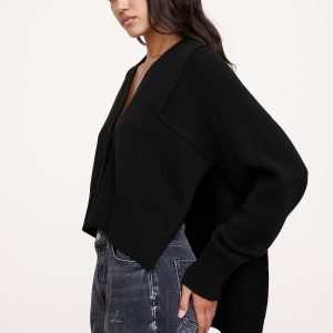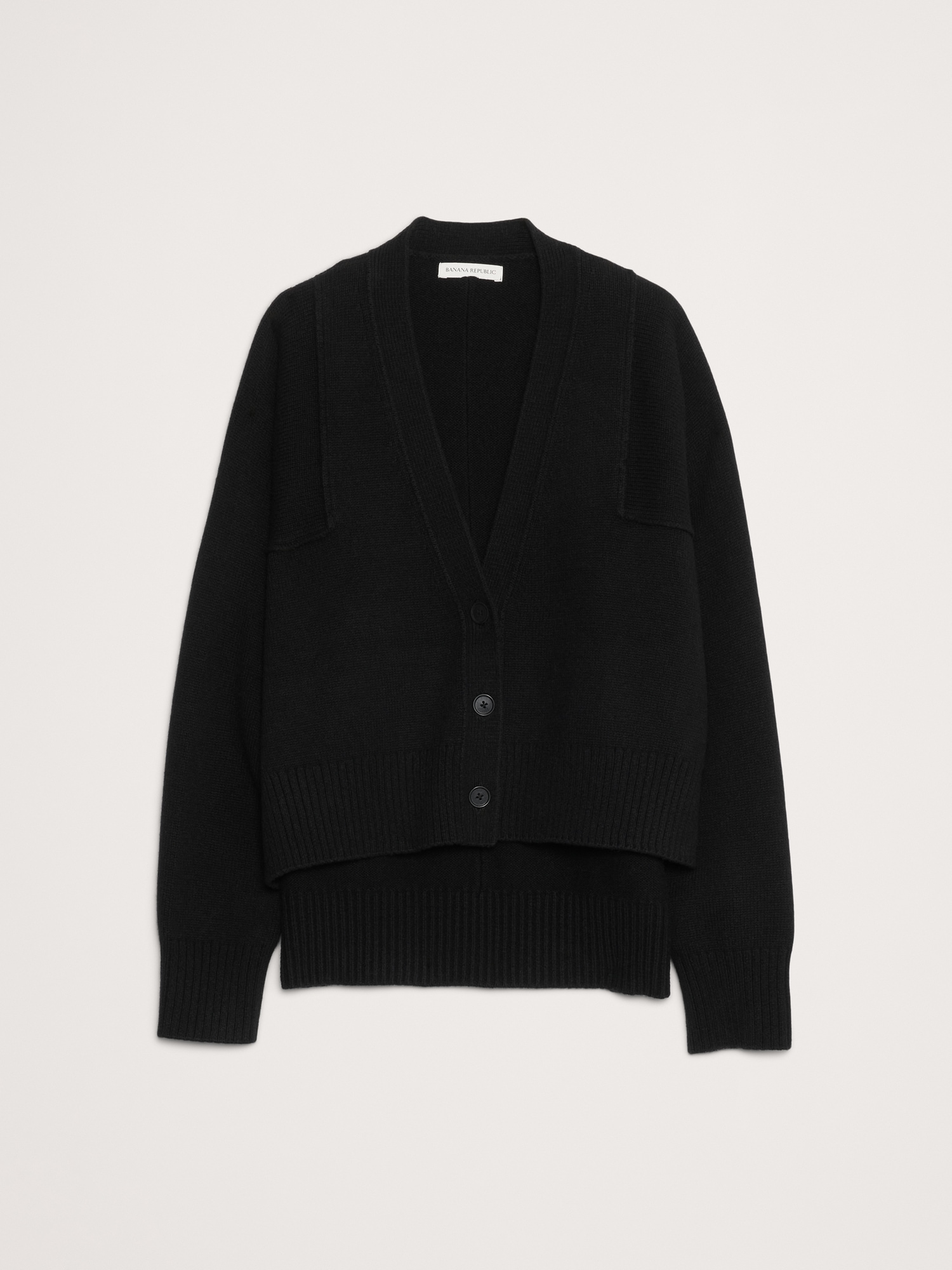 Deconstructed, reconstructed. We crafted this cardigan sweater with exposed seam details, a high-low, hem and slits at the sides. Cut in a soft and warm Merino wool and cotton yarn.