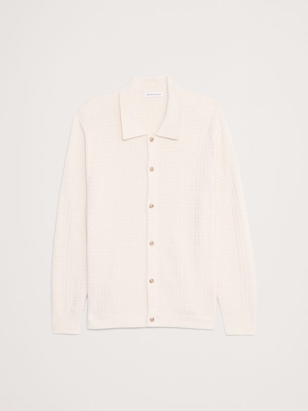 We’re loving sweater polos now (and always), so we designed this cotton one with a full-button front using a special stitch combo to create a plaid texture.