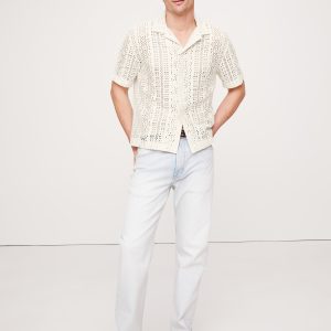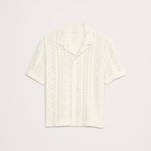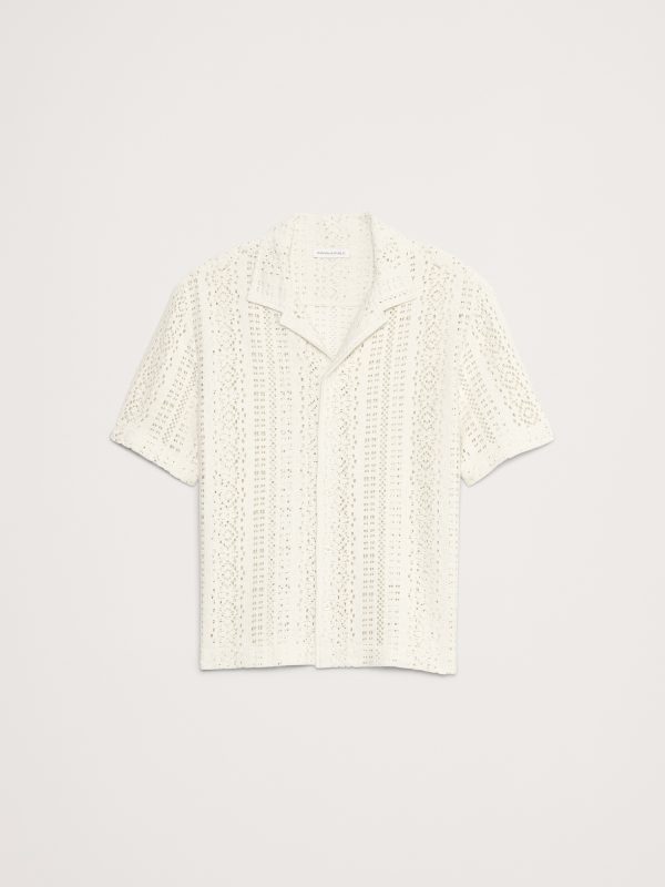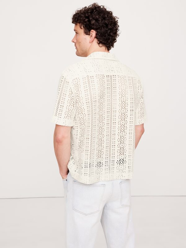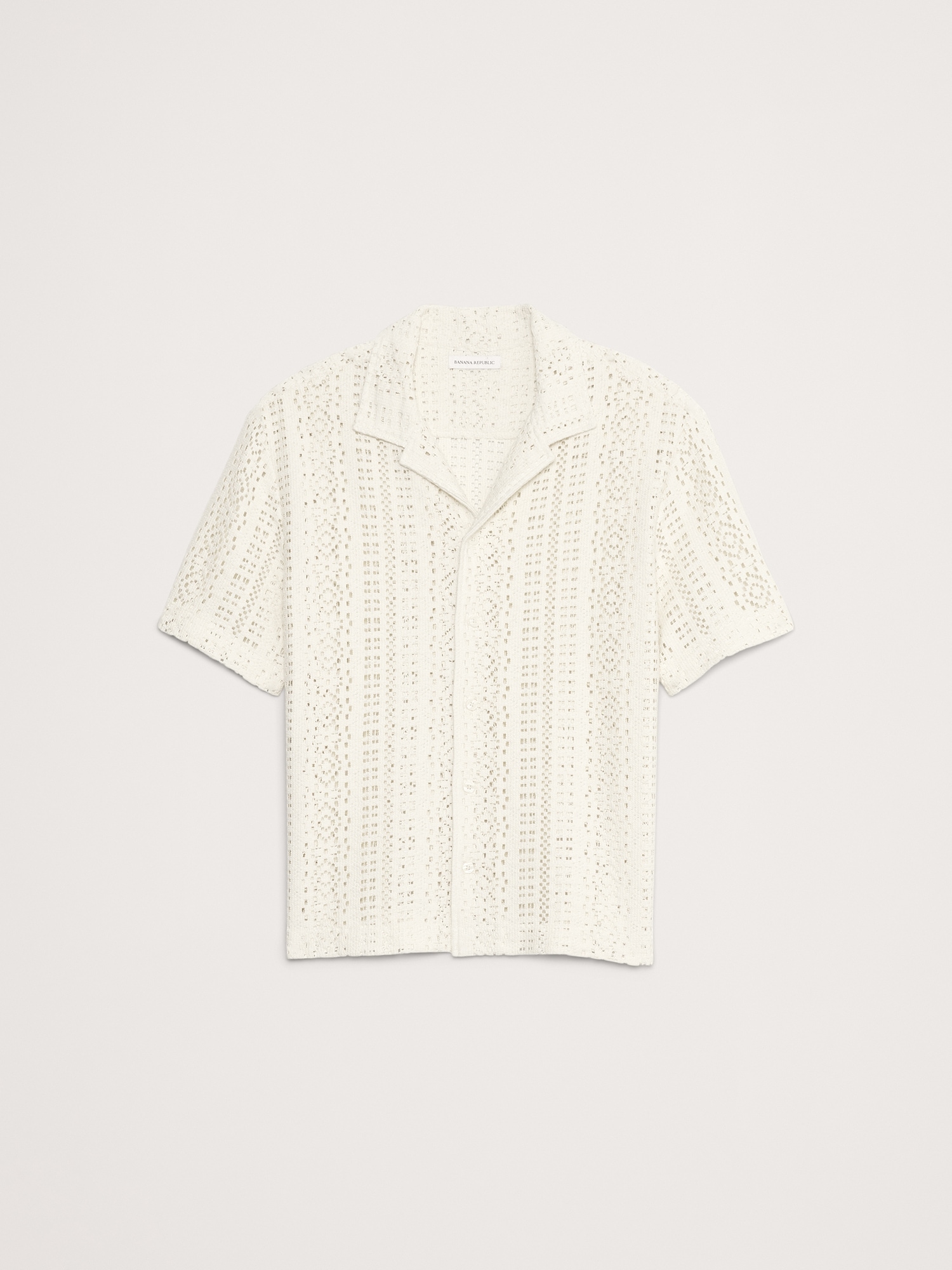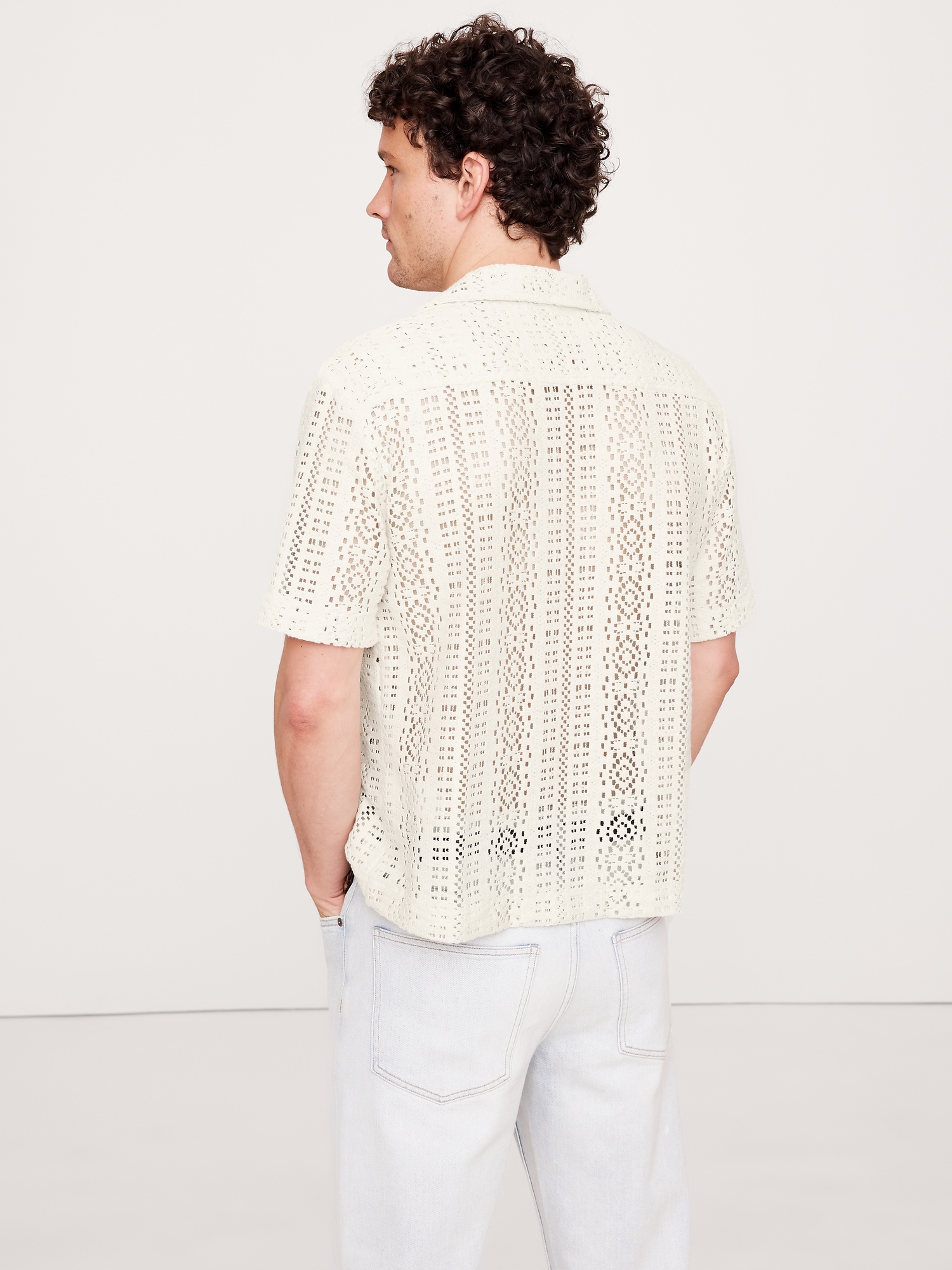 We wanted this resort shirt to capture the feel of the best vintage pieces so we chose a lace fabric that mimics the look of true crochet.