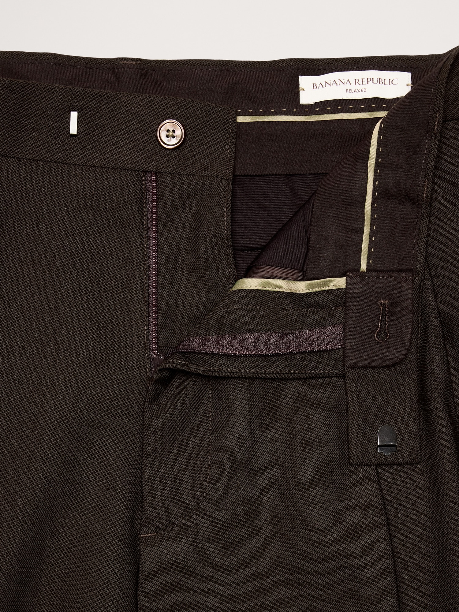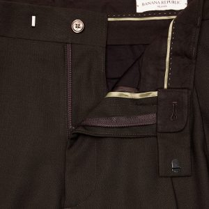 Zip fly with hook-and-bar closure. Belt loops.