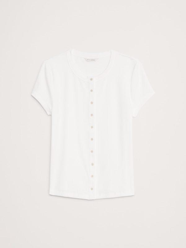 A classic crew-neck tee meets cardigan styling, we kept the fit slim for this Ribbed Top, adding a row of beautiful horn buttons down the front so you can button as high or low as you like.