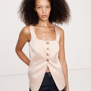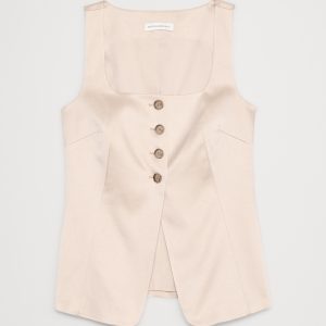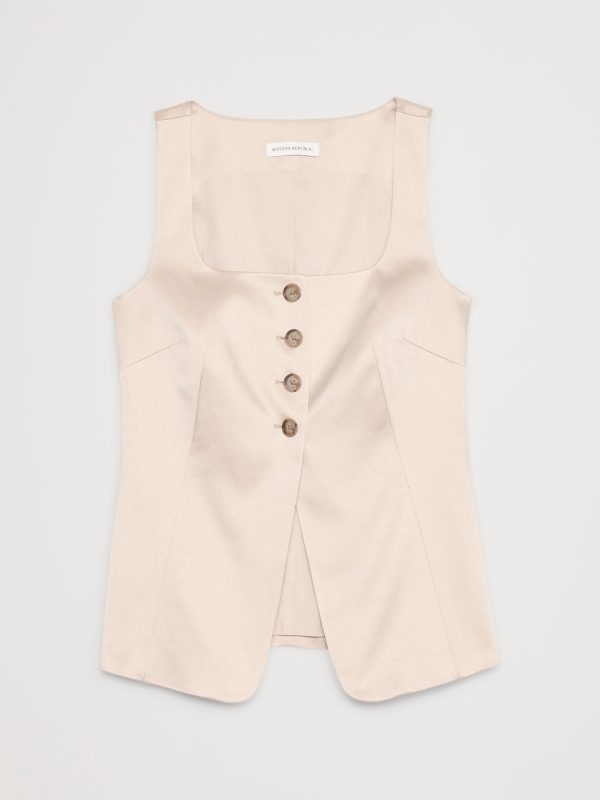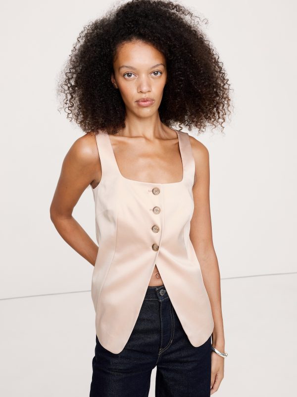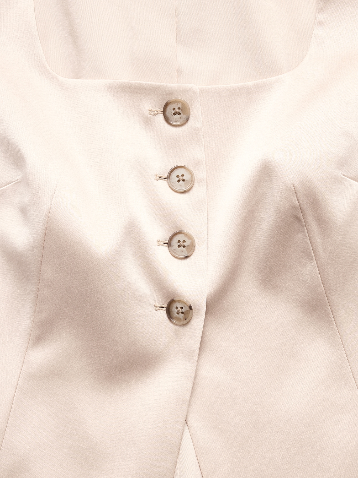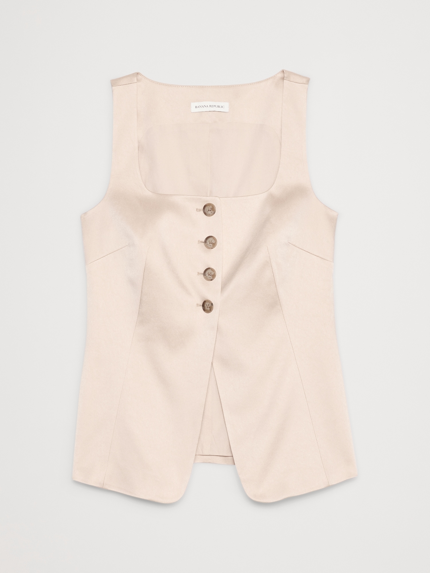 We cut this square-neck vest in a longer length with a square neckline, in a soft satin fabric. Make it a set with the matching kick-flare pant.