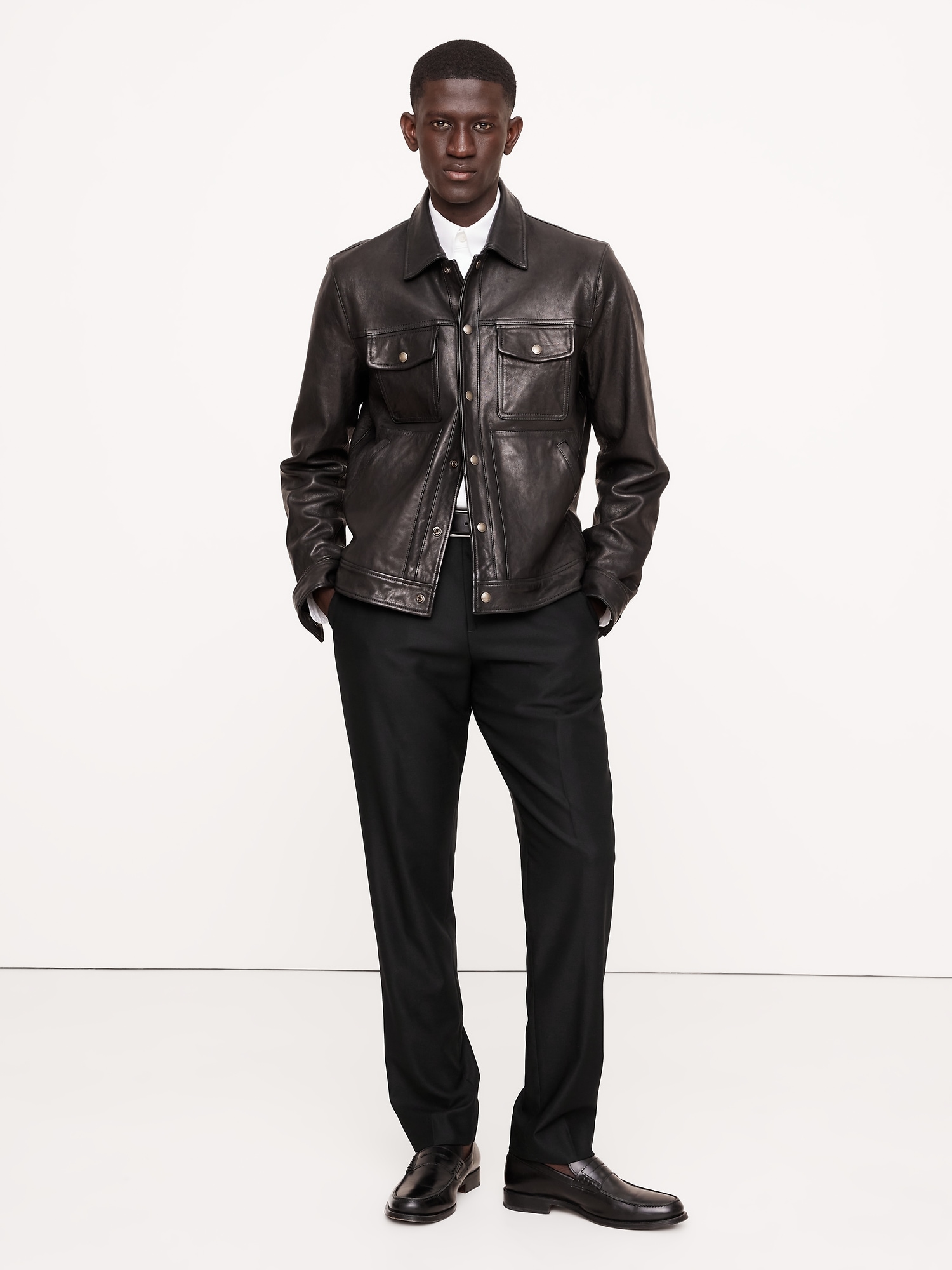 Zip fly with button closure. Front and back crease.
