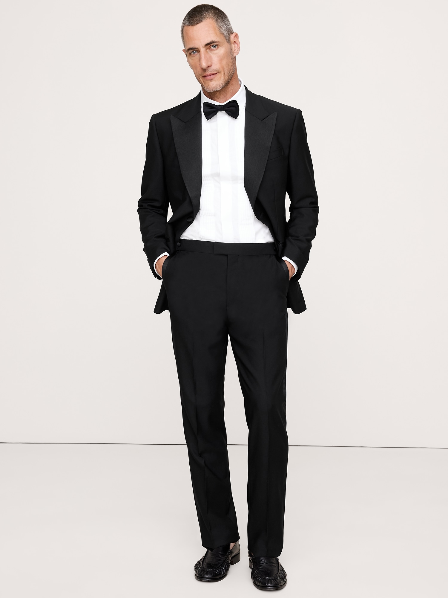 A tuxedo as special as the occasions it’ll see. Note: the Italian wool barathea fabric, the silk faille tuxedo stripe at the sides, and the crisp trouser crease (so they formal).