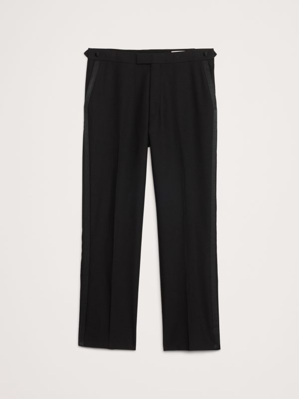 A tuxedo as special as the occasions it’ll see. Note: the Italian wool barathea fabric, the silk faille tuxedo stripe at the sides, and the crisp trouser crease (so they formal). Here, in a straight-leg silhouette.