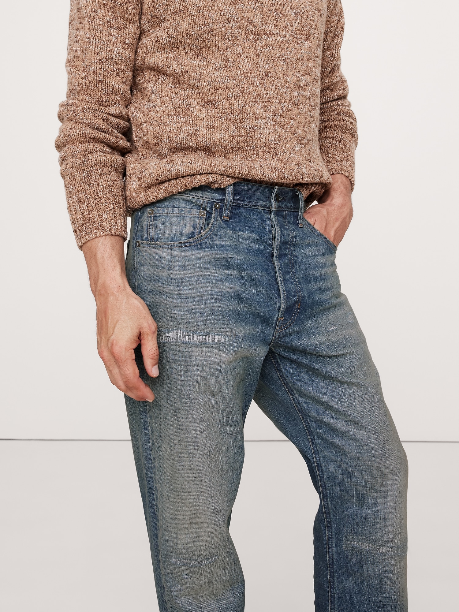 We love selvedge denim, so we set out to create the perfect pair of straight-leg jeans with a vintage-but-better look. Here, the denim is a 14oz-weight so it’s rugged, but light enough for every day wear and will only get better with time. Fit: Mid-rise (12.375\”). Slim through the thigh with a straight leg.