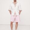 Zip fly with button closure. Elastic waistband with internal drawstring.