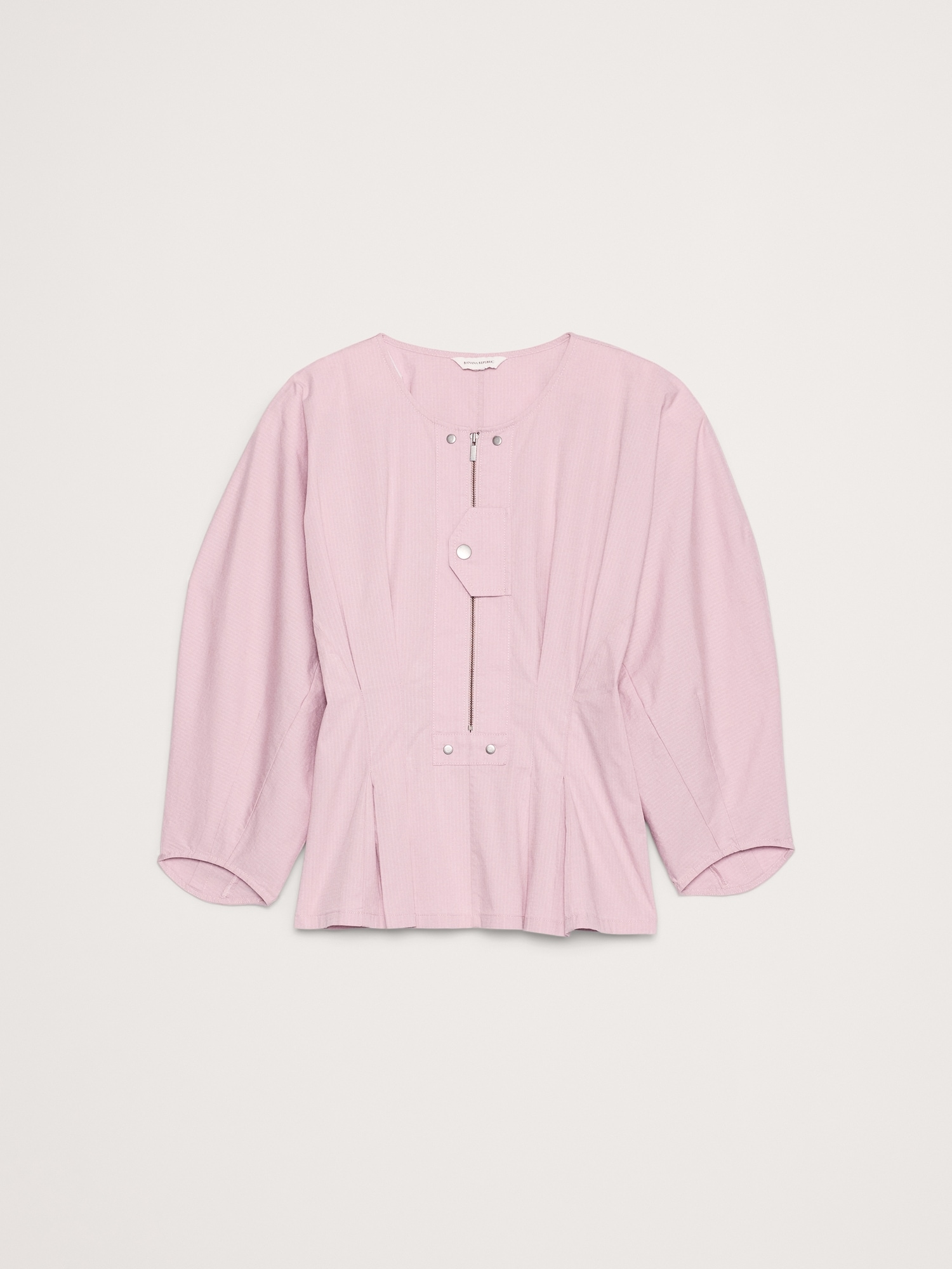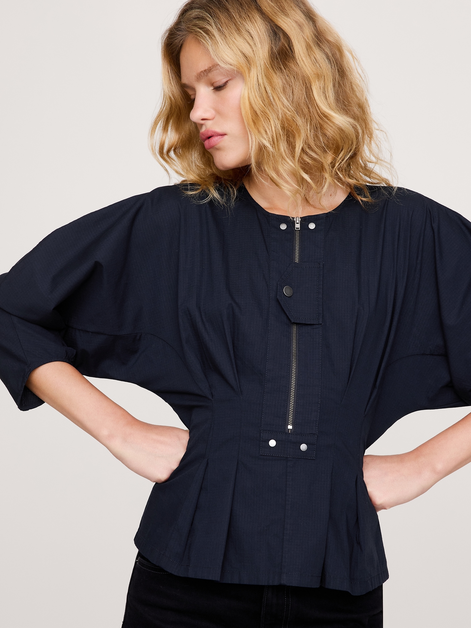 A shirt that says \”I got this\”. We reimagined utility details to create a twist on the classic button placket, seen here in a balloon-sleeve top cut from our stretch-cotton ripstop fabric, with its signature grid texture.
