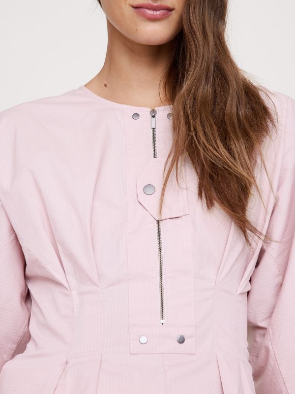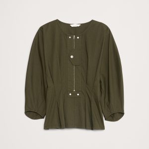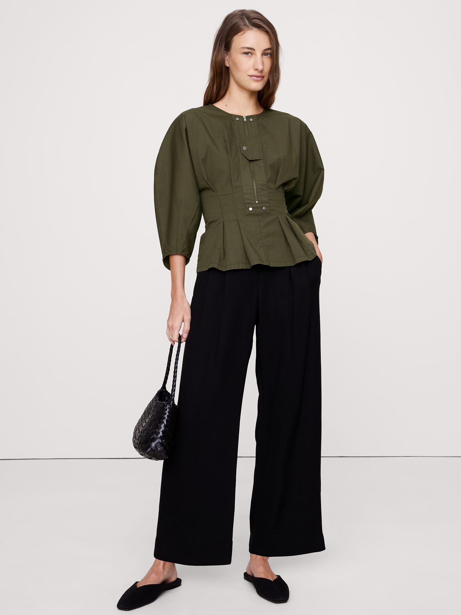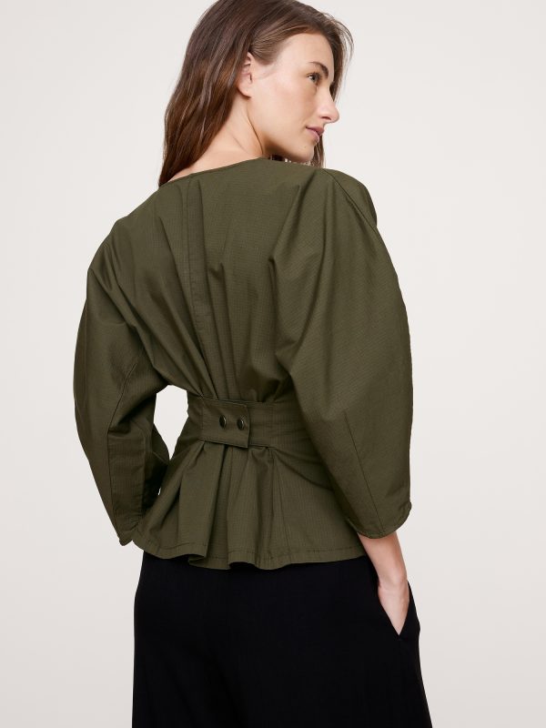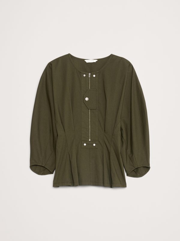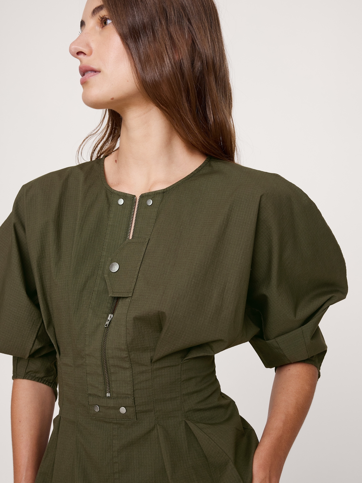 A shirt that says \”I got this\”. We reimagined utility details to create a twist on the classic button placket, seen here in a balloon-sleeve top cut from our stretch-cotton ripstop fabric, with its signature grid texture.