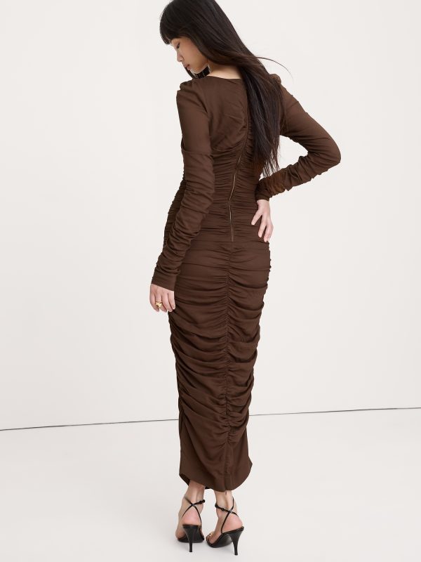 Made from intricated ruched panels, this figure-hugging midi dress is cut from our favorite crepe fabric—one we love for its dry handfeel, timeless look, and softness against the skin. Sheath fit. Square neck. Invisible zip at back. Center back vent. Fully lined. #829272