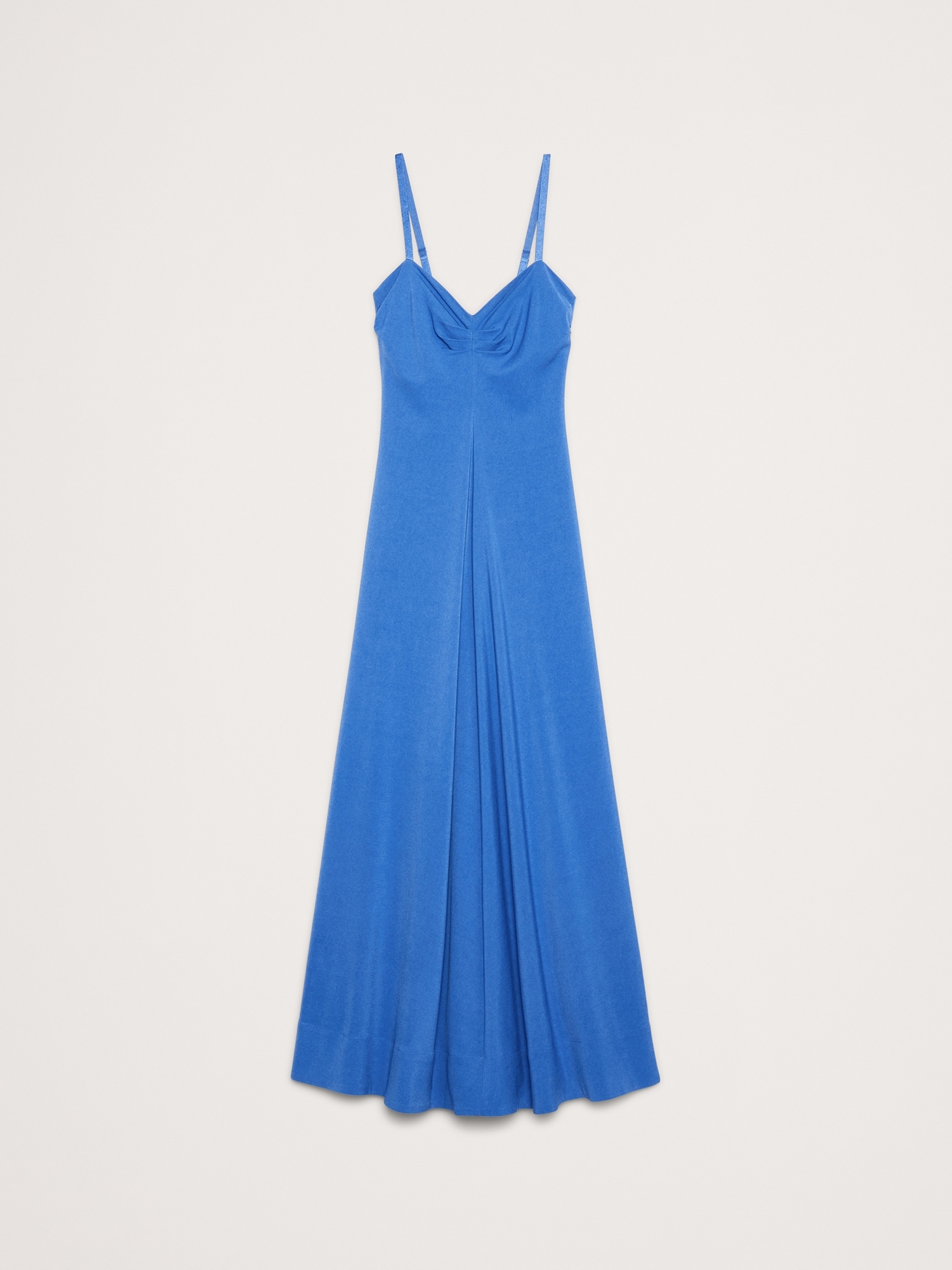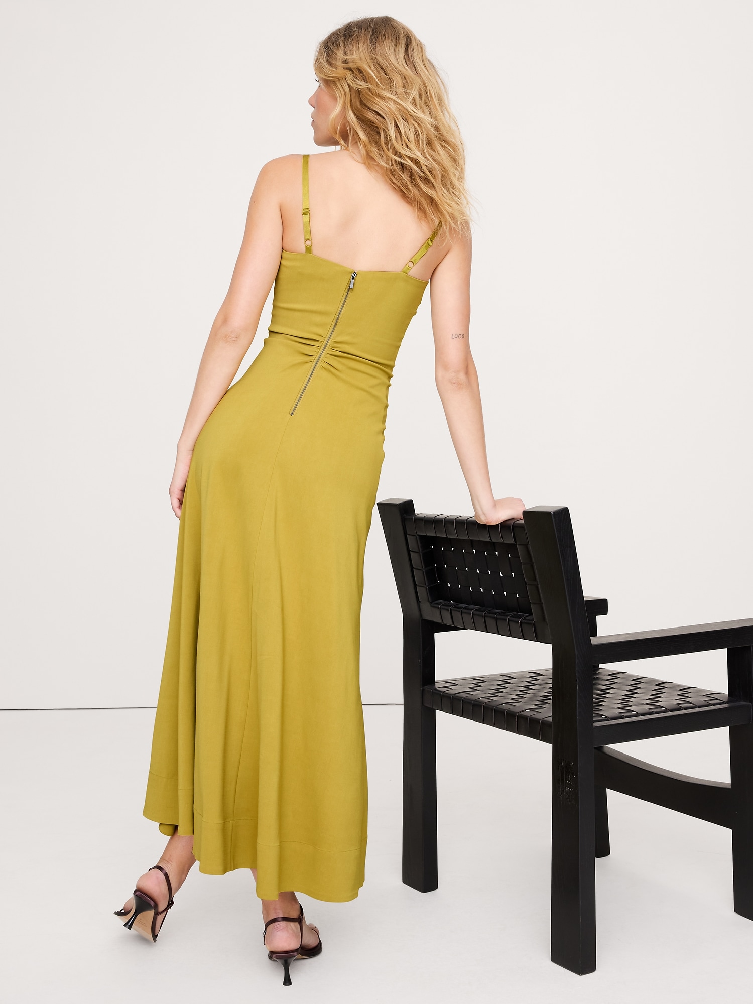 Be a little sweetheart. This stretch-sateen dress achieves its silhouette with a bias-cut construction and ruching at the bust and back waist. Plus, the ankle length looks great with heels or flats.