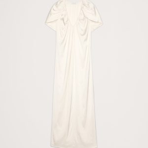 Make an entrance in this maxi dress. There’s a lot to love: the stretch satin fabric, the cape-sleeve detail, and the statuesque, column silhouette.