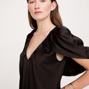 Make an entrance in this maxi dress. There’s a lot to love: the stretch satin fabric, the cape-sleeve detail, and the statuesque, column silhouette.