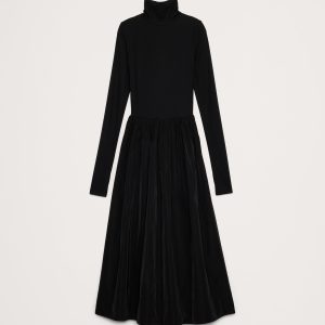 This maxi dress combines two favorites: a sleek knit jersey for the bodice and a full, taffeta skirt. Plus, we made the sleeves extra-long and added thumbholes just for fun.