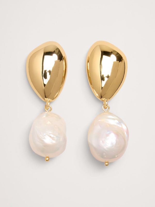 Stylish post earrings pair shapely gold-plated brass pebbles with gorgeous freshwater baroque pearls.
