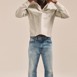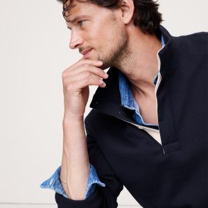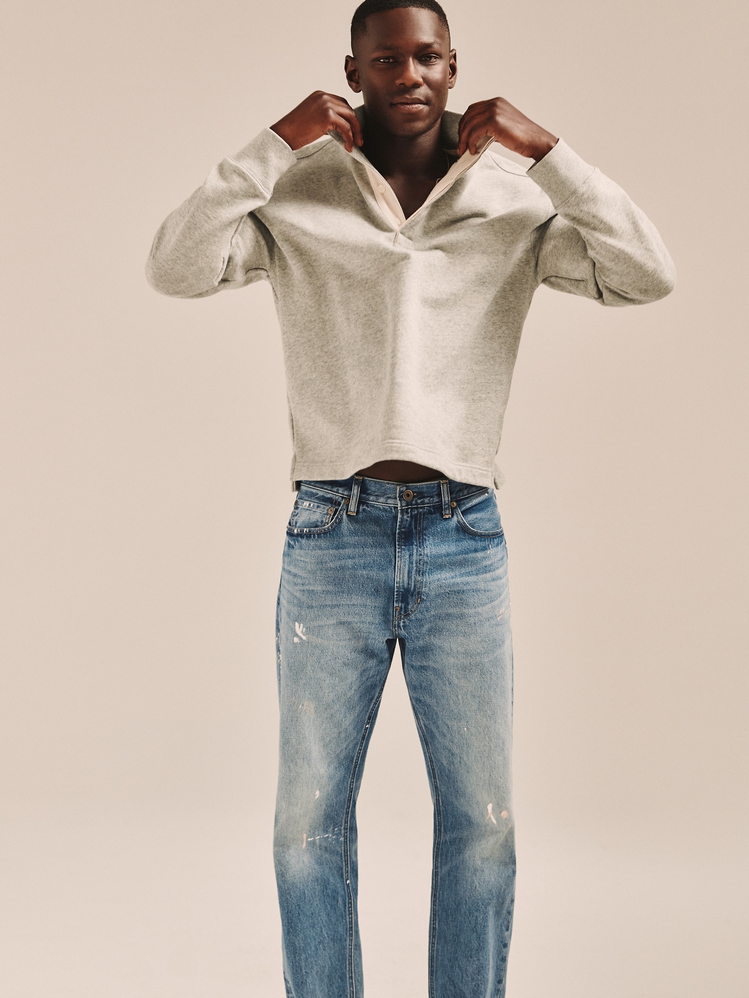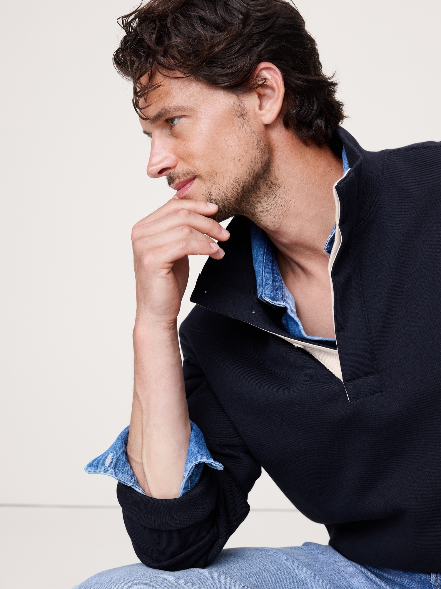 Not just terry. fabric we love for its all-weather weight. Here, a relaxed version of a vintage rugby jersey, with hidden buttons at the neck and an on-trend, above-hip length.