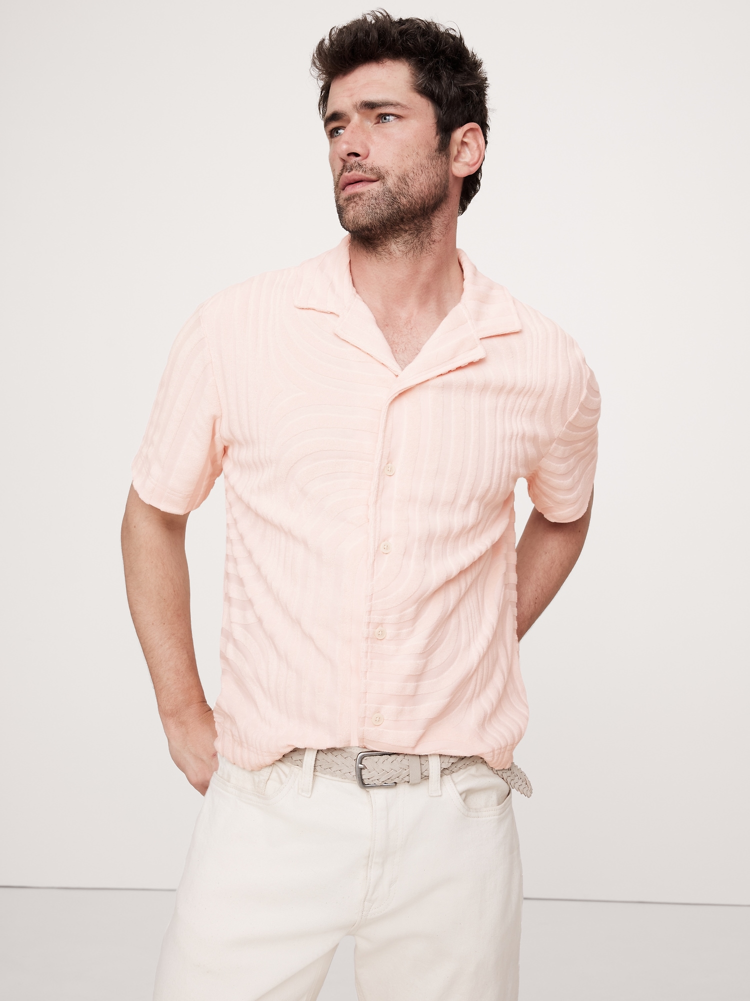 A classic resort shirt, made for warm-weather in a toweling terry fabric in geometric patterns. Make it a set with the matching shorts.