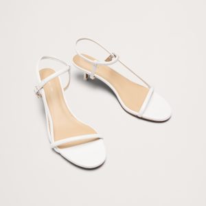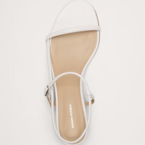 Set atop a modest kitten heel, these sleek almond-toe sandals are crafted with puffy, Italian leather straps that wrap around the foot and ankle for a secure fit.