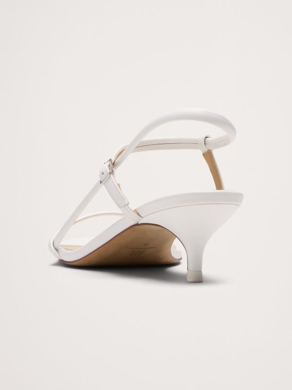 Set atop a modest kitten heel, these sleek almond-toe sandals are crafted with puffy, Italian leather straps that wrap around the foot and ankle for a secure fit.