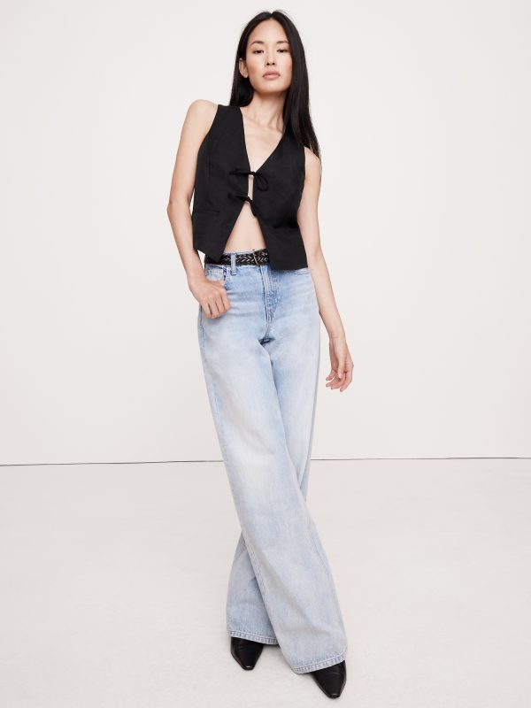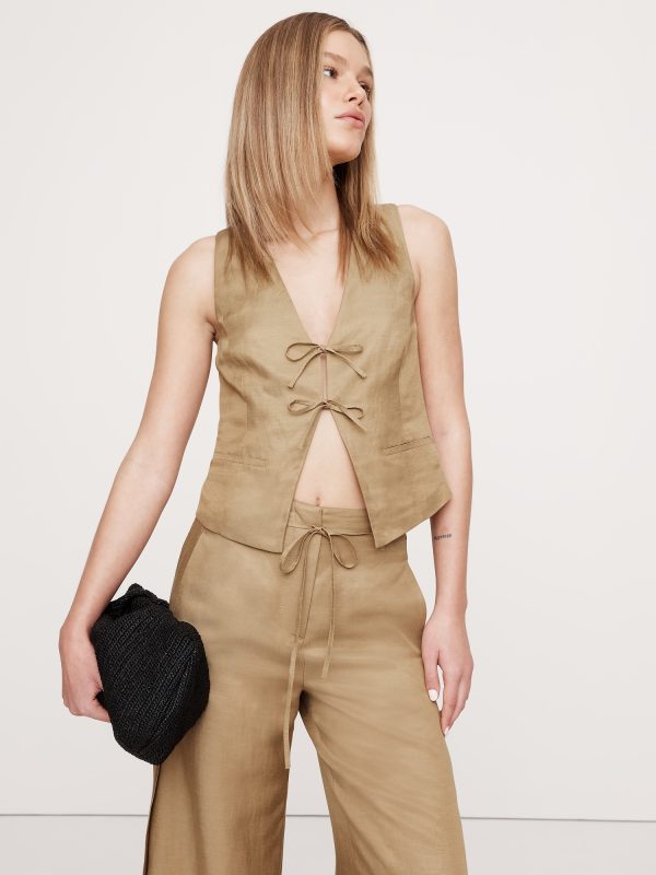 An easy tie-front vest, cut in a silky blend of viscose and linen—an ideal choice in hot, humid weather. Make it a set with the matching pant.